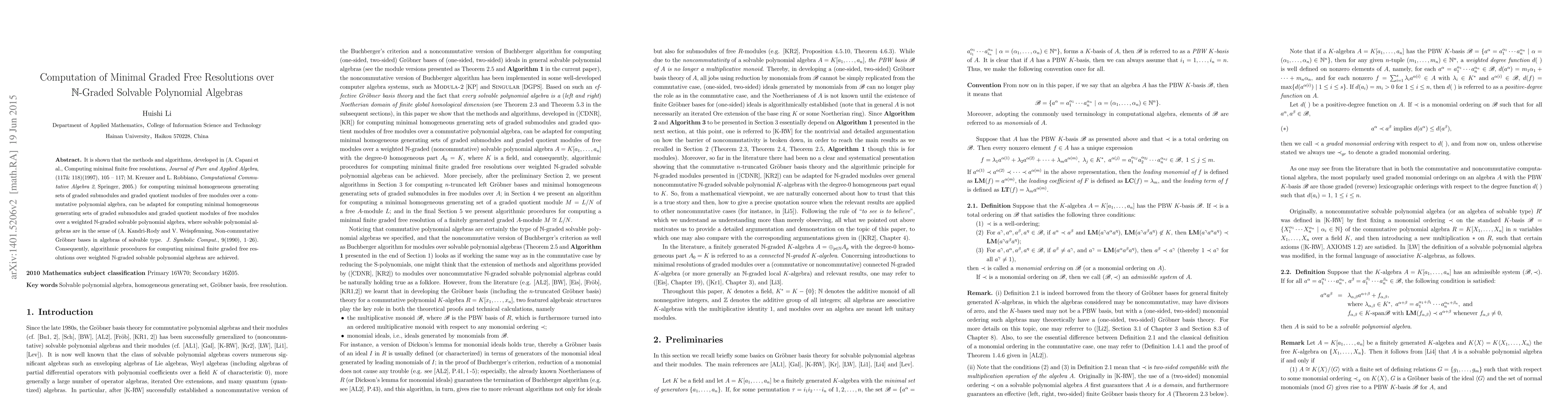 This paper adapts existing methods for computing minimal homogeneous generating sets over commutative polynomial algebras to compute minimal graded free resolutions over weighted $\mathbb{N}$-graded solvable polynomial algebras, achieving algorithmic procedures for such resolutions.
