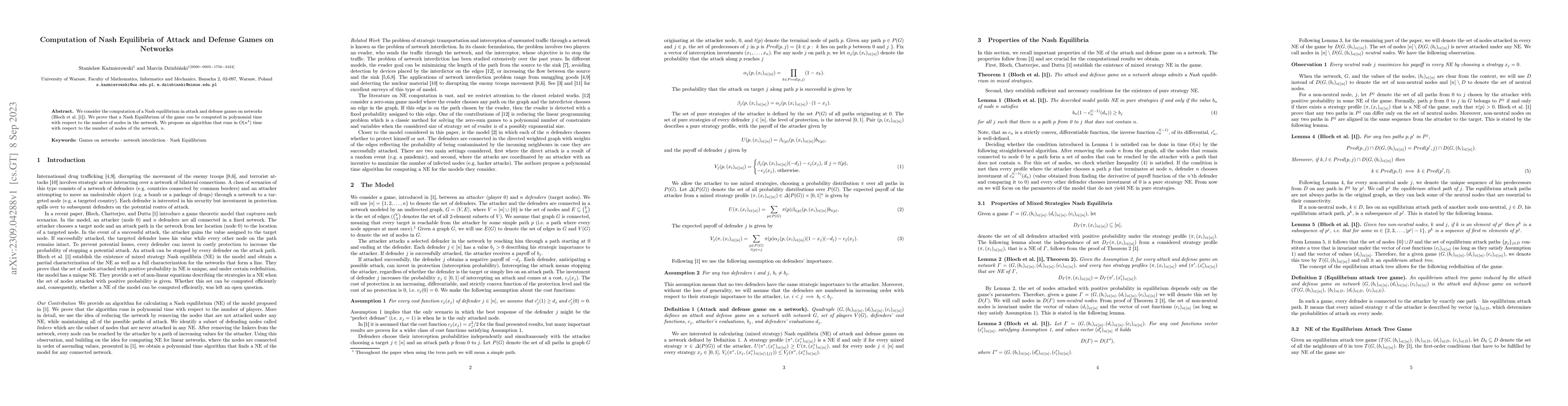 This paper presents a polynomial-time algorithm for computing Nash equilibria in attack and defense games on networks, demonstrating an O(n^4) time complexity with respect to the number of nodes, n. The approach provides an efficient method for determining optimal strategies for both attackers and defenders.