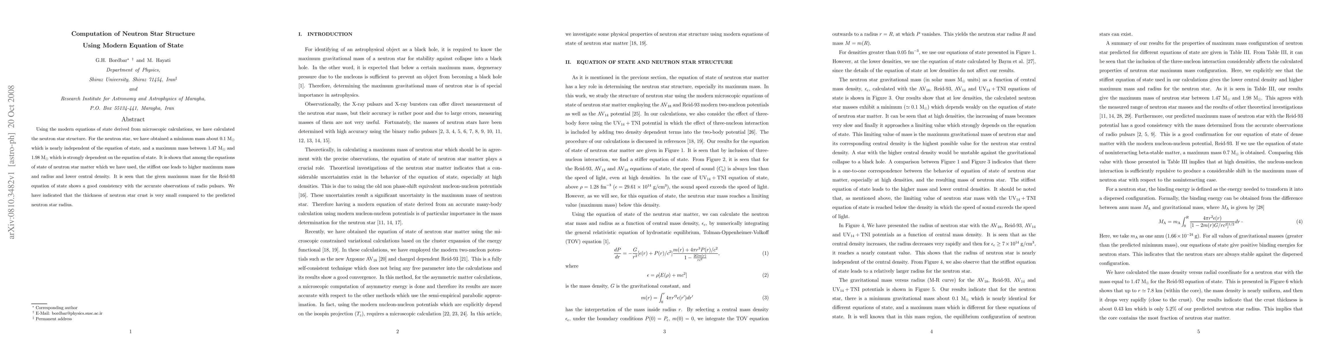 This paper computes neutron star structure using modern equations of state, finding a minimum mass around $0.1 {\rm M_{\odot}}$ and a maximum mass range from $1.47 {\rm M_{\odot}}$ to $1.98 {\rm M_{\odot}}$, with the latter strongly influenced by the equation of state used.