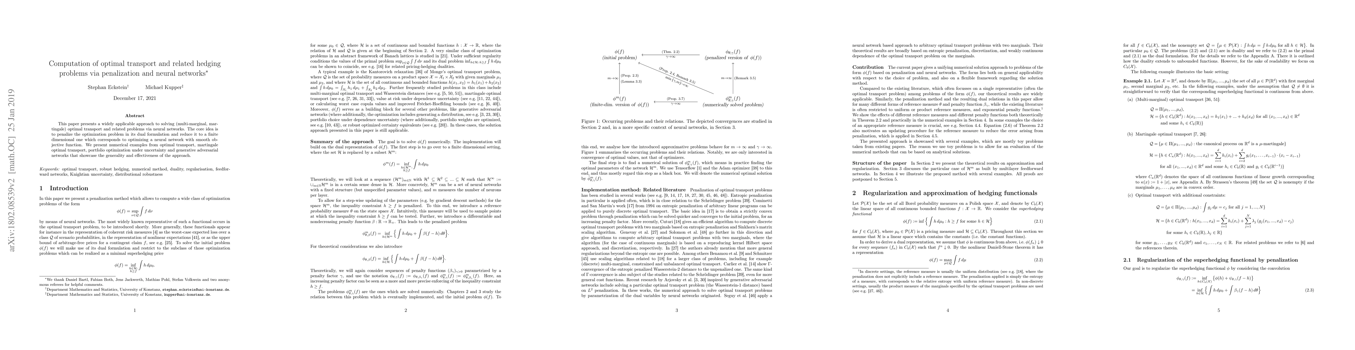 This paper introduces a novel method for solving optimal transport and related problems using neural networks by penalizing the dual optimization problem, transforming it into a finite-dimensional problem. Numerical examples demonstrate its effectiveness across various applications including portfolio optimization and generative adversarial networks.