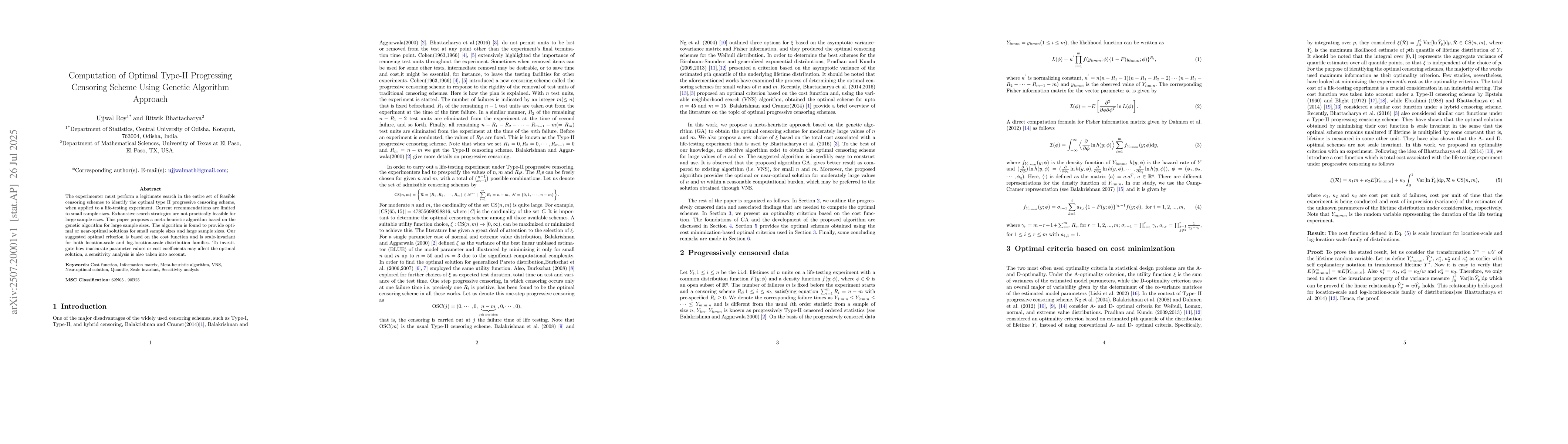 This work is novel as it introduces a meta-heuristic algorithm (GA) to tackle the problem of optimal censoring schemes for large sample sizes, providing a more practical solution compared to exhaustive search strategies, and extends the applicability of cost-function-based optimization to a wider range of distribution families and cost coefficients.