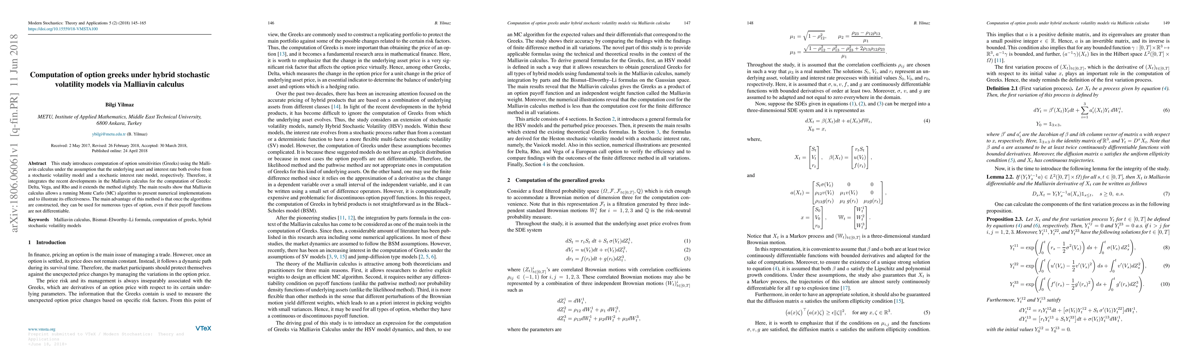 This paper develops a method for computing option Greeks using Malliavin calculus under hybrid stochastic volatility and interest rate models. It demonstrates the effectiveness of this method through a running Monte Carlo algorithm, highlighting its applicability to various option types regardless of their payoff function's differentiability.