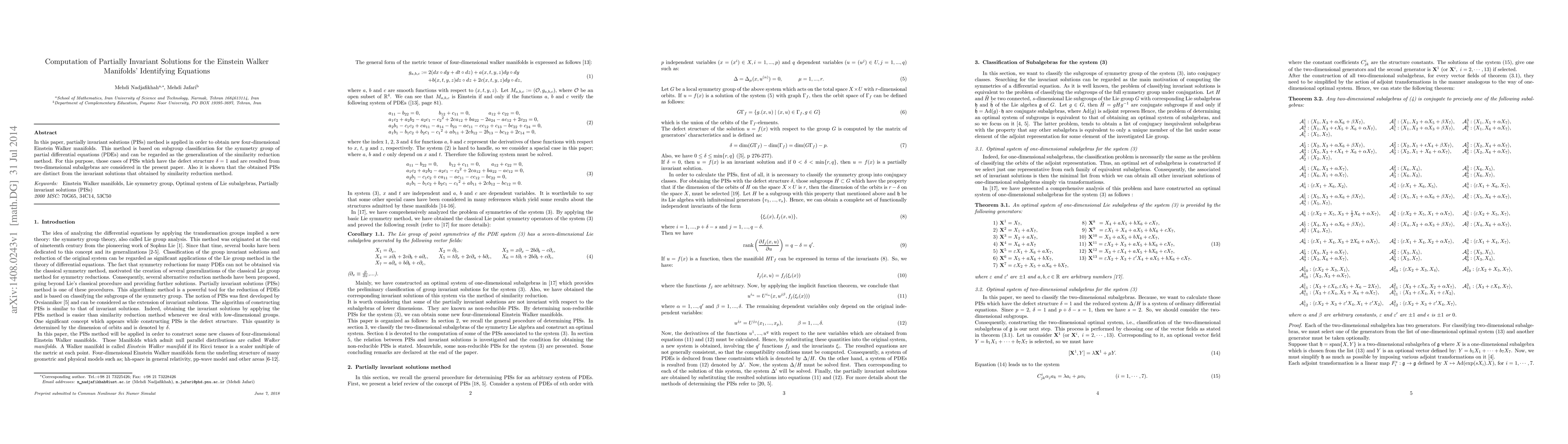 In this paper, partially invariant solutions (PISs) method is applied in order to obtain new four-dimensional Einstein Walker manifolds. This method is based on subgroup classification for the symmetry group of partial differential equations (PDEs) and can be regarded as the generalization of the similarity reduction method. For this purpose, those cases of PISs which have the defect structure delta=1 and are resulted from two-dimensional subalgebras are considered in the present paper. Also it is shown that the obtained PISs are distinct from the invariant solutions that obtained by similarity reduction method.