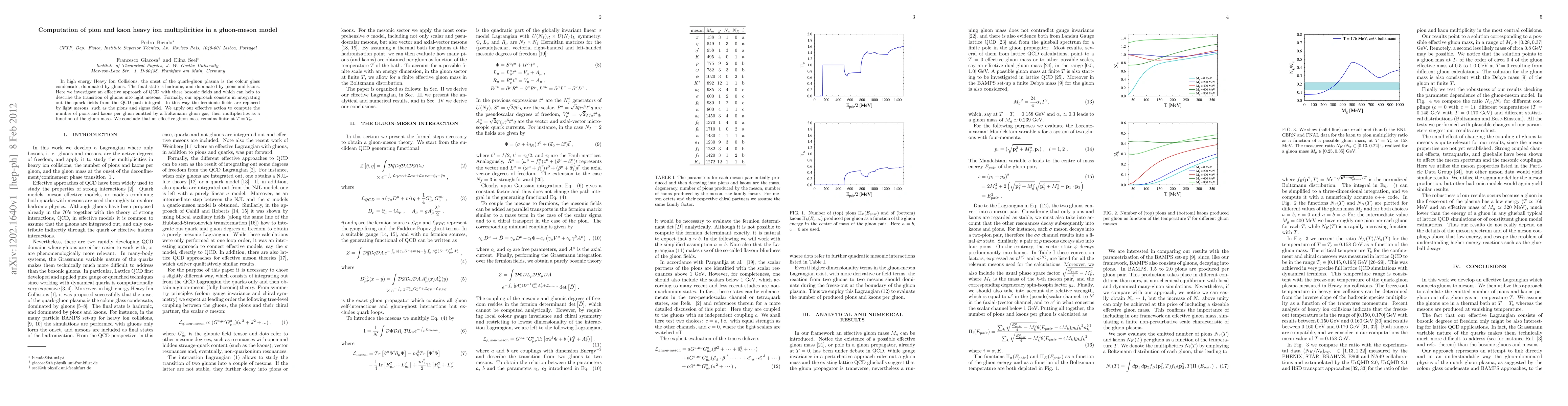 In high energy Heavy Ion Collisions, the onset of the quark-gluon plasma is the colour glass condensate, dominated by gluons. The final state is hadronic, and dominated by pions and kaons. Here we investigate an effective approach of QCD with these bosonic fields and which can help to describe the transition of gluons into light mesons. Formally, our approach consists in integrating out the quark fields from the QCD path integral, utilizing auxiliary fields. In this way the fermionic fields are replaced by light mesons, such as the pions and sigma field. We apply our effective action to compute the number of pions and kaons per gluon emitted by a Boltzmann gluon gas, their multiplicities as function of a gluon mass. We conclude that an effective gluon mass remains finite at T=Tc.