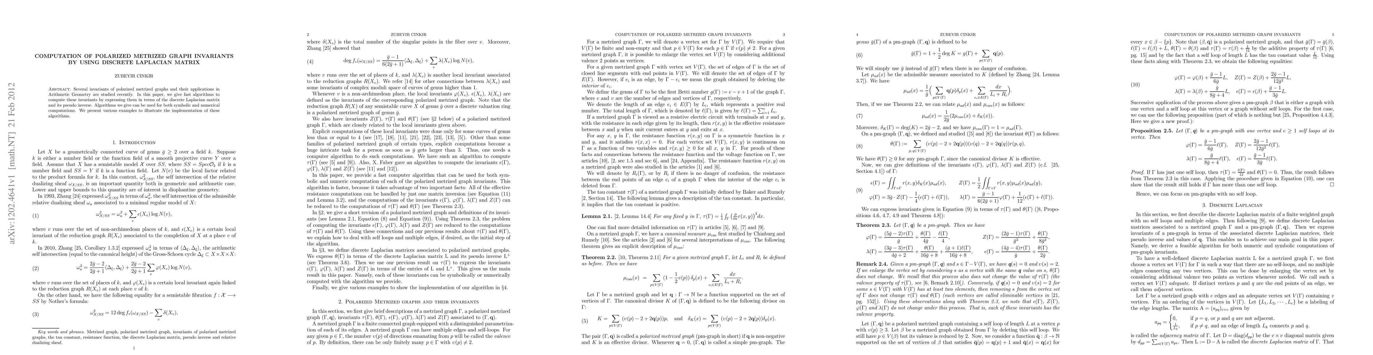 Several invariants of polarized metrized graphs and their applications in Arithmetic Geometry are studied recently. In this paper, we give fast algorithms to compute these invariants by expressing them in terms of the discrete Laplacian matrix and its pseudo inverse. Algorithms we give can be used for both symbolic and numerical computations. We present various examples to illustrate the implementation of these algorithms.