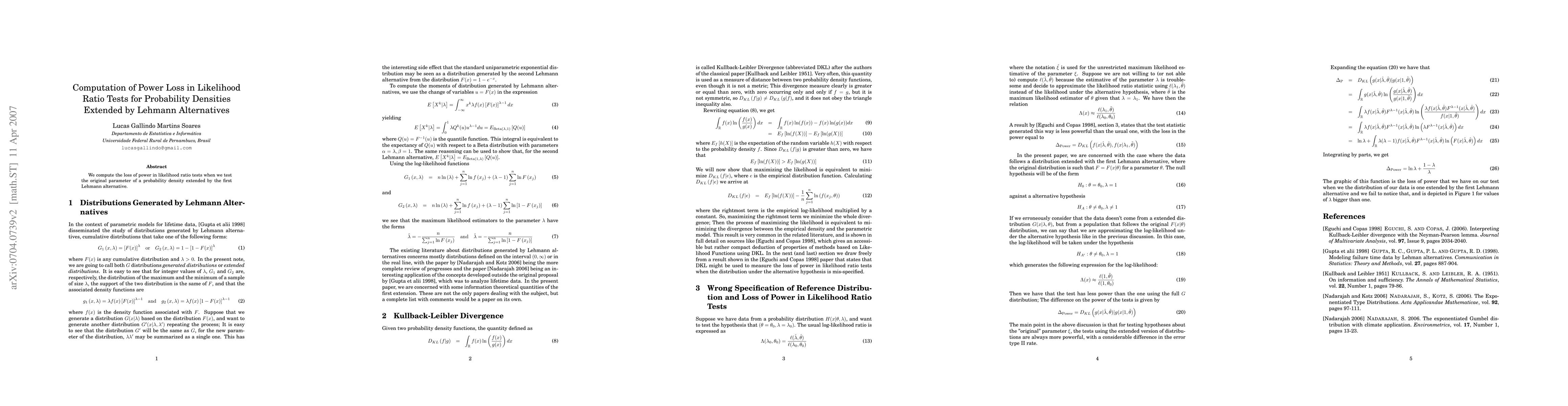 Summary: This paper quantifies the reduction in power for likelihood ratio tests when evaluating the original parameter of a probability density against the first Lehmann alternative. The study focuses on understanding the impact of extending the parameter space in such statistical tests.