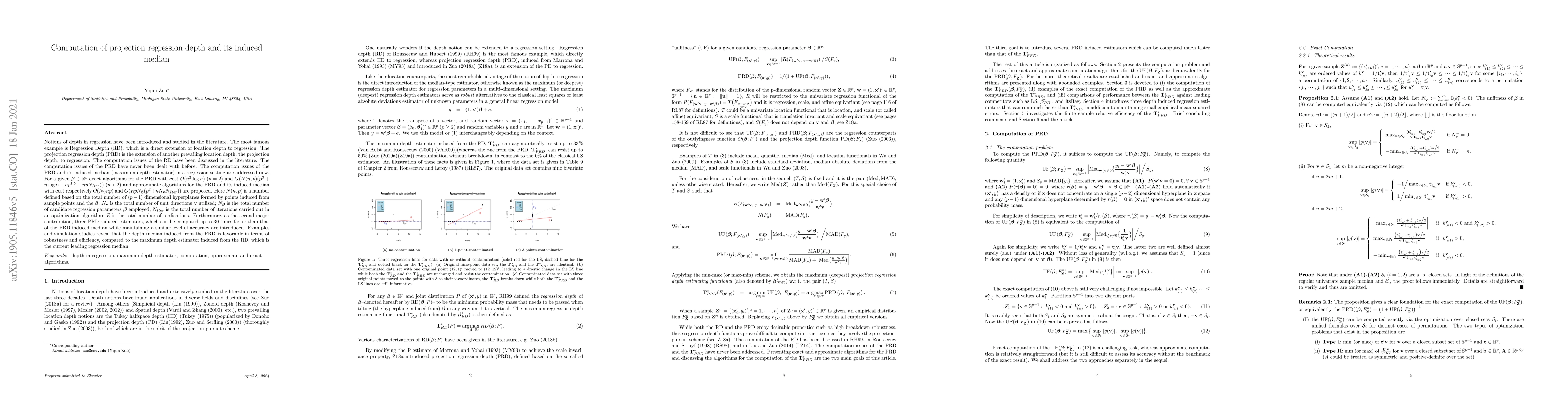 This paper addresses the computation of projection regression depth (PRD) and its induced median in regression settings. It proposes exact and approximate algorithms for PRD computation, along with three efficient estimators that maintain accuracy while significantly reducing computation time.