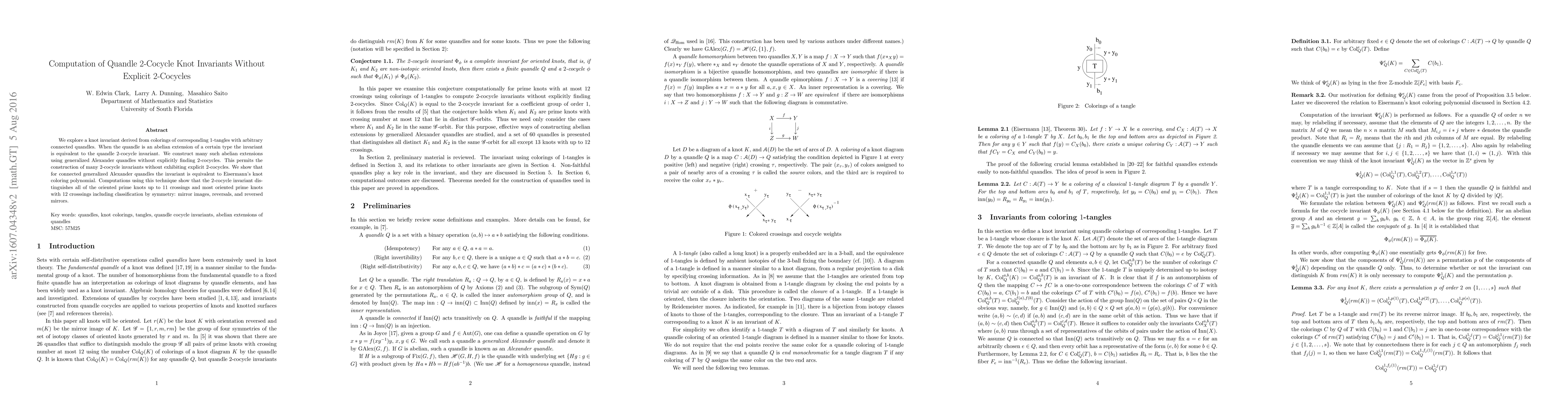 We explore a knot invariant derived from colorings of corresponding $1$-tangles with arbitrary connected quandles. When the quandle is an abelian extension of a certain type the invariant is equivalent to the quandle $2$-cocycle invariant. We construct many such abelian extensions using generalized Alexander quandles without explicitly finding $2$-cocycles. This permits the construction of many $2$-cocycle invariants without exhibiting explicit $2$-cocycles. We show that for connected generalized Alexander quandles the invariant is equivalent to Eisermann's knot coloring polynomial. Computations using this technique show that the $2$-cocycle invariant distinguishes all of the oriented prime knots up to 11 crossings and most oriented prime knots with 12 crosssings including classification by symmetry: mirror images, reversals, and reversed mirrors.