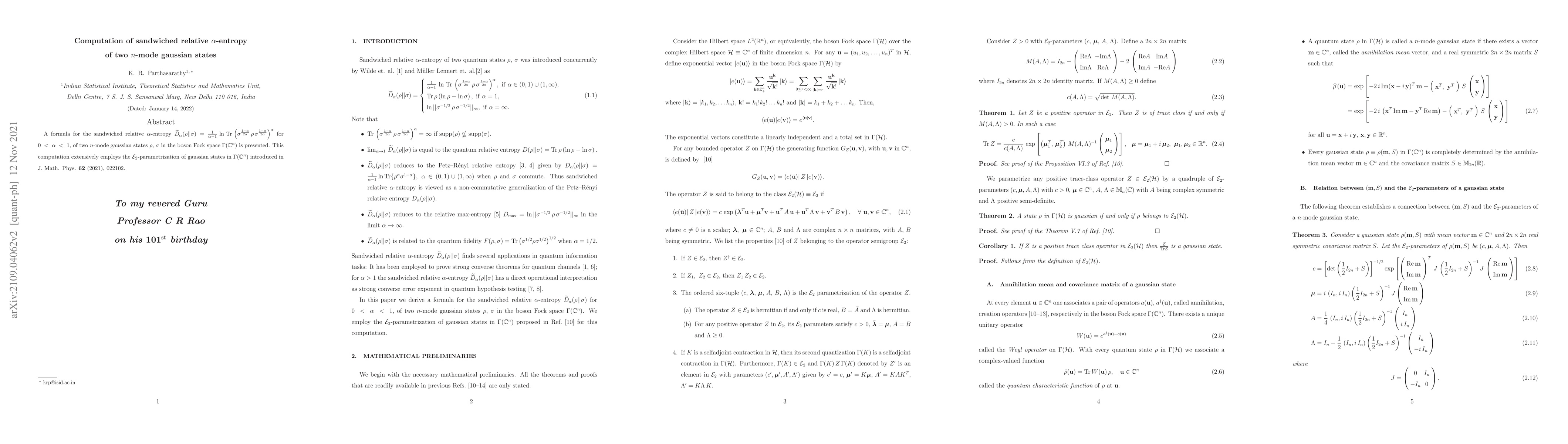 A formula for the sandwiched relative $\alpha$-entropy $\widetilde{D}_\alpha(\rho\vert\vert\sigma)=\frac{1}{\alpha-1}\, \ln\,{\rm Tr}\, \left(\sigma^{\frac{1-\alpha}{2\alpha}}\,\rho\,\sigma^{\frac{1-\alpha}{2\alpha}}\right)^\alpha$ for $0 < \alpha < 1$, of two $n$ mode gaussian states $\rho$, $\sigma$ in the boson Fock space $\Gamma(\mathbb{C}^n)$ is presented. This computation extensively employs the $\mathcal{E}_2$-parametrization of gaussian states in $\Gamma(\mathbb{C}^n)$ introduced in J. Math. Phys. {\bf 62} (2021), 022102.