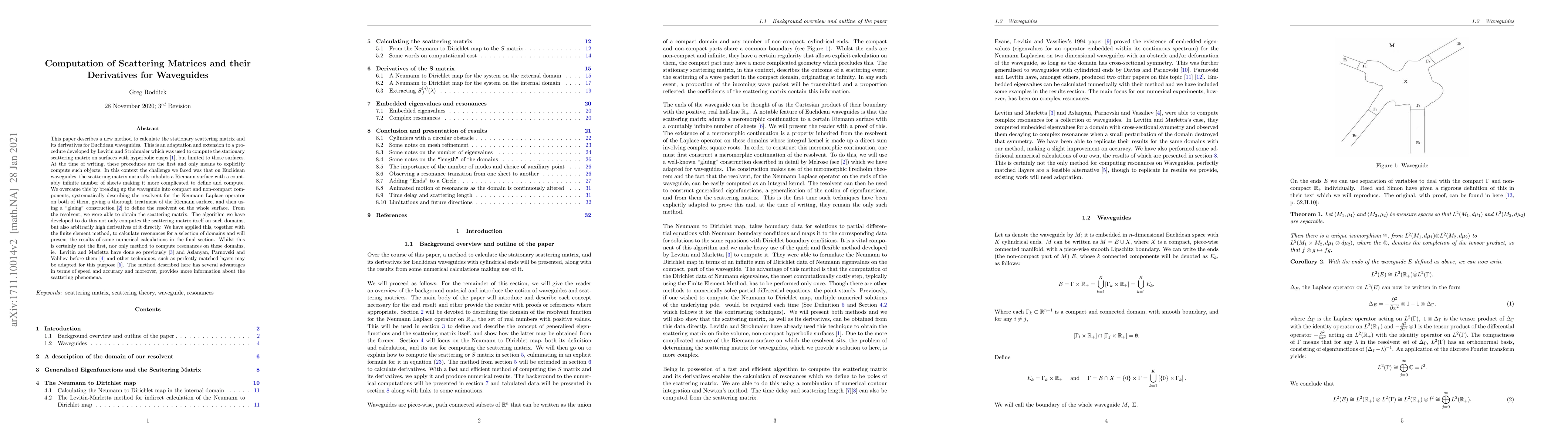 This paper describes the calculation of the stationary scattering matrix and its derivatives for Euclidean waveguides. This is an adaptation and extension to a procedure developed by Levitin and Strohmaier which was used to compute the stationary scattering matrix \cite{alexnew}. On Euclidean waveguides, the scattering matrix can be meromorphically continued from the complex plane to a Riemann surface with a countably infinite number of sheets. We describe in detail how we have dealt with this. In addition, our algorithm is also able to calculate arbitrarily high derivatives. In the final section, we will present the results of some numerical calculations obtained using this method.