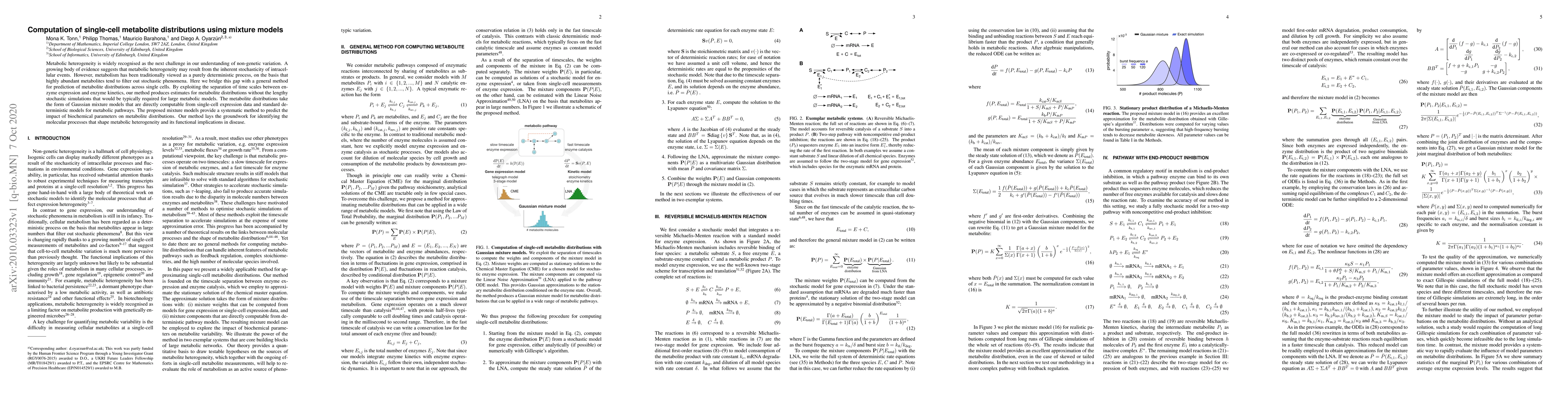 This paper presents a novel method to predict single-cell metabolite distributions using Gaussian mixture models, bridging the deterministic view of metabolism with stochastic intracellular events. The approach leverages time scale separation in enzyme kinetics to provide estimates without extensive stochastic simulations.