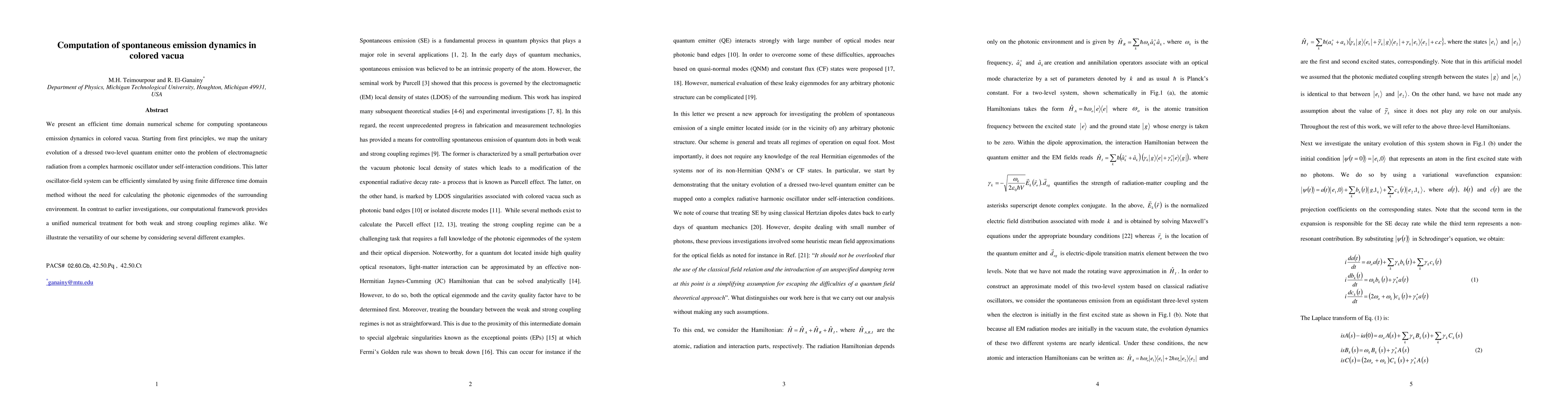 We present an efficient time domain numerical scheme for computing spontaneous emission dynamics in colored vacua. Starting from first principles, we map the unitary evolution of a dressed two-level quantum emitter onto the problem of electromagnetic radiation from a complex harmonic oscillator under self-interaction conditions. This latter oscillator-field system can be efficiently integrated by using finite difference time domain method without the need for calculating the photonic eigenmodes of the surrounding environment. In contrast to earlier investigations, our computational framework provides a unified numerical treatment for both weak and strong coupling regimes alike. We illustrate the versatility of our scheme by considering several different examples.