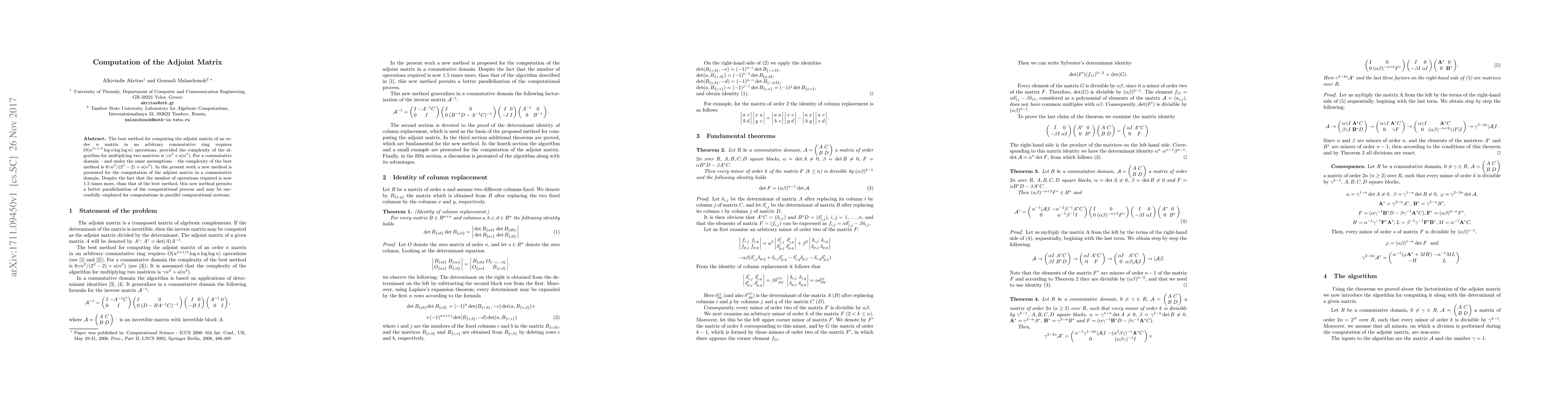The best method for computing the adjoint matrix of an order $n$ matrix in an arbitrary commutative ring requires $O(n^{\beta+1/3}\log n \log \log n)$ operations, provided the complexity of the algorithm for multiplying two matrices is $\gamma n^\beta+o(n^\beta)$. For a commutative domain -- and under the same assumptions -- the complexity of the best method is ${6\gamma n^\beta}/{(2^{\beta}-2)}+o(n^\beta)$. In the present work a new method is presented for the computation of the adjoint matrix in a commutative domain. Despite the fact that the number of operations required is now 1.5 times more, than that of the best method, this new method permits a better parallelization of the computational process and may be successfully employed for computations in parallel computational systems.