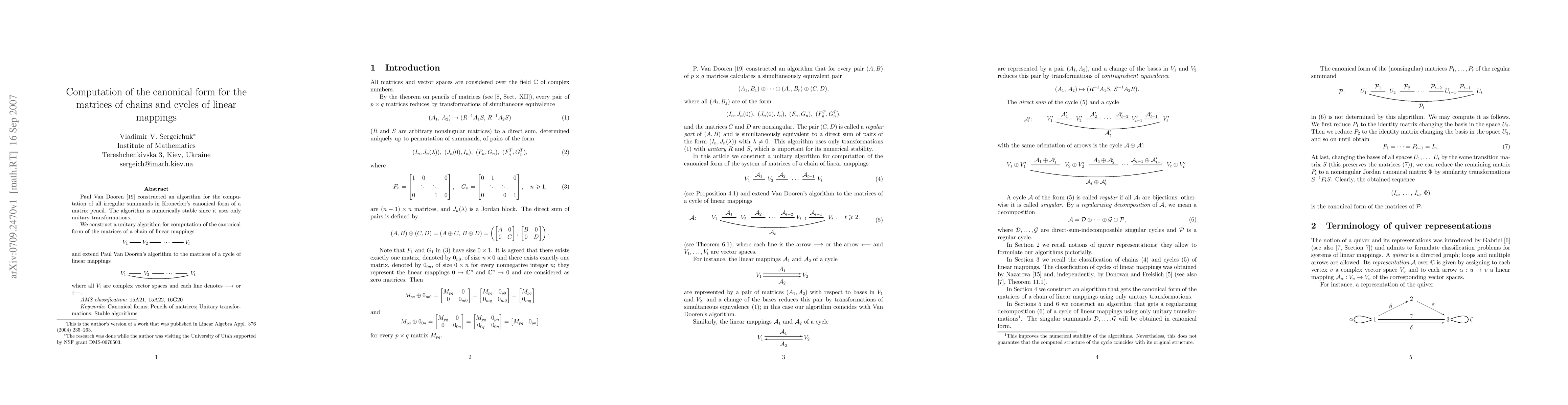 Researchers extended Paul Van Dooren's algorithm to compute the canonical form for matrices of cycles of linear mappings, improving numerical stability with unitary transformations.
