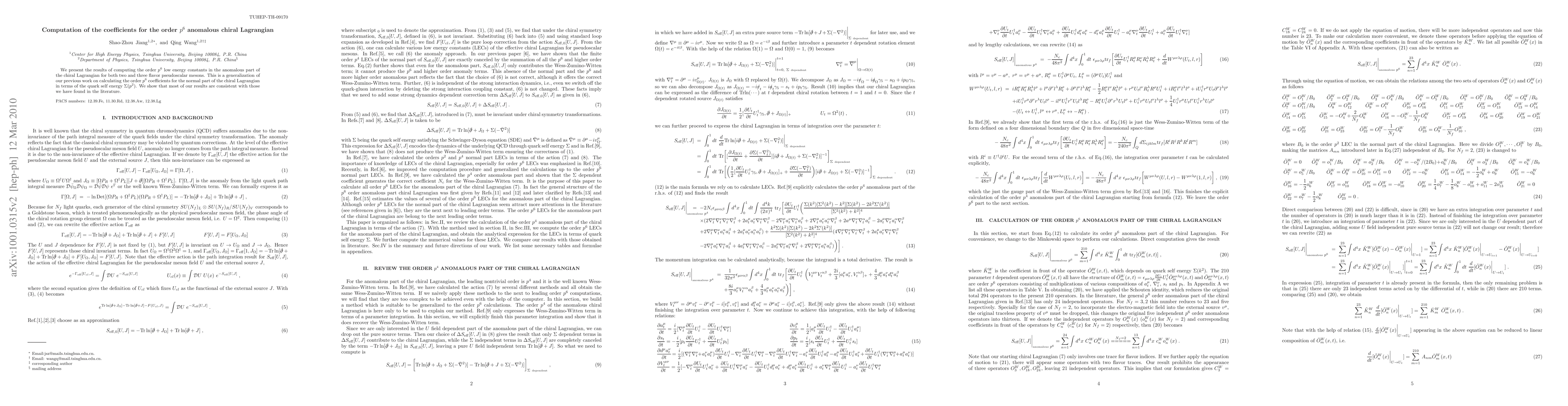 We present the results of computing the $p^6$ order low energy constants in the anomalous part of chiral Lagrangian both for two and three flavor pseudoscalar mesons. This is a generalization of our previous work on calculating the $p^6$ order coefficients for the normal part chiral Lagrangian in terms of the quark self energy $\Sigma(p^2)$. We show that most of our results are consistent with those we can find in the literature.
