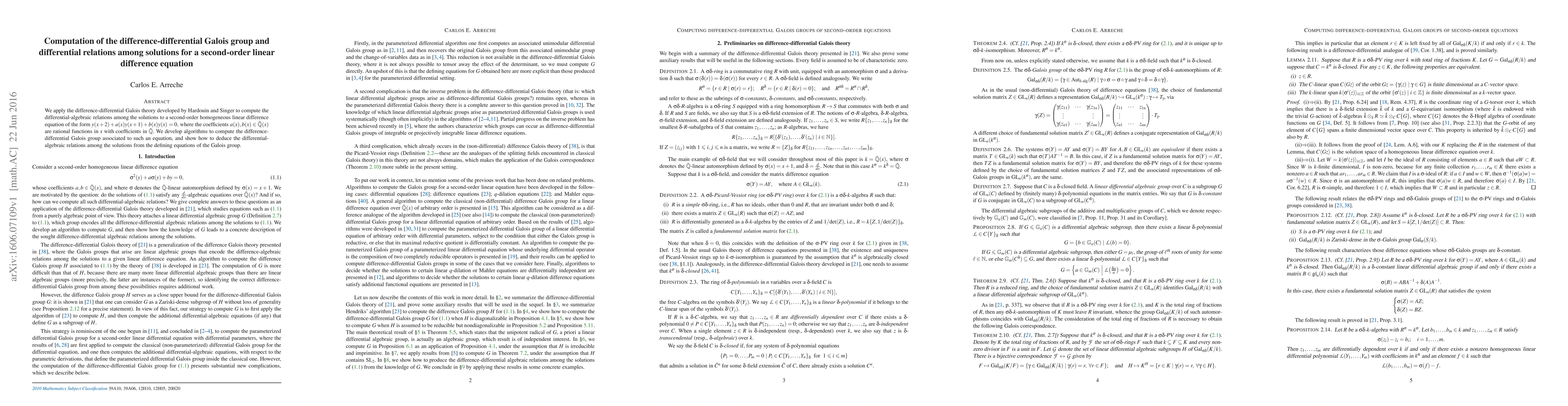 This paper applies difference-differential Galois theory to compute the differential-algebraic relations among solutions for a second-order linear difference equation, developing algorithms to determine the associated difference-differential Galois group and deduce solution relations from the Galois group's defining equations.