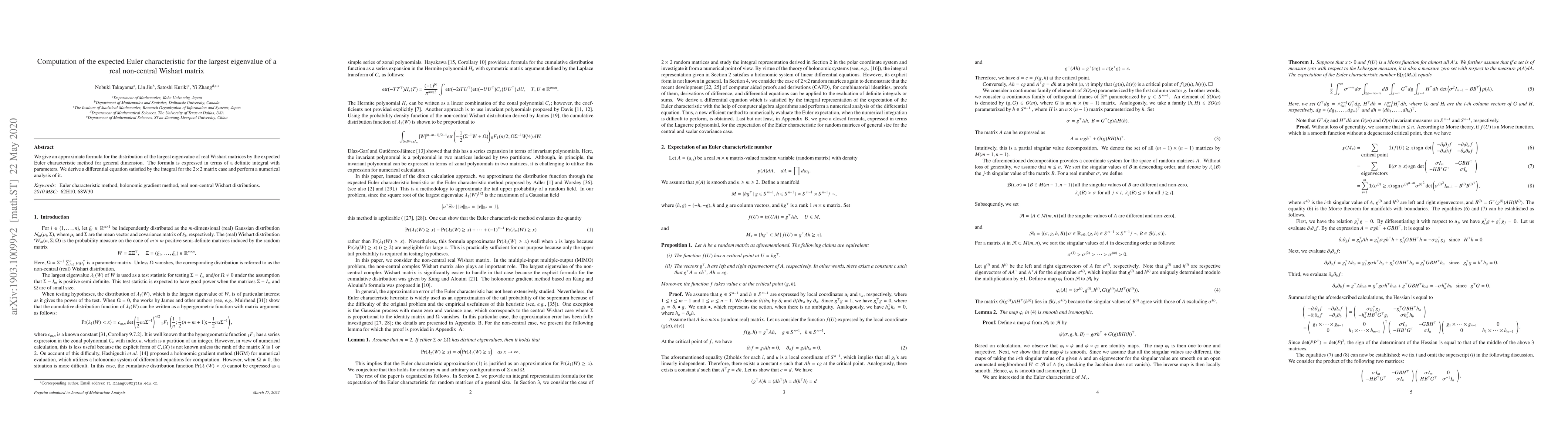 The paper provides an approximate formula for the distribution of the largest eigenvalue of real Wishart matrices using the expected Euler characteristic method. It focuses on deriving a differential equation satisfied by the integral for the 2x2 matrix case and performing numerical analysis.