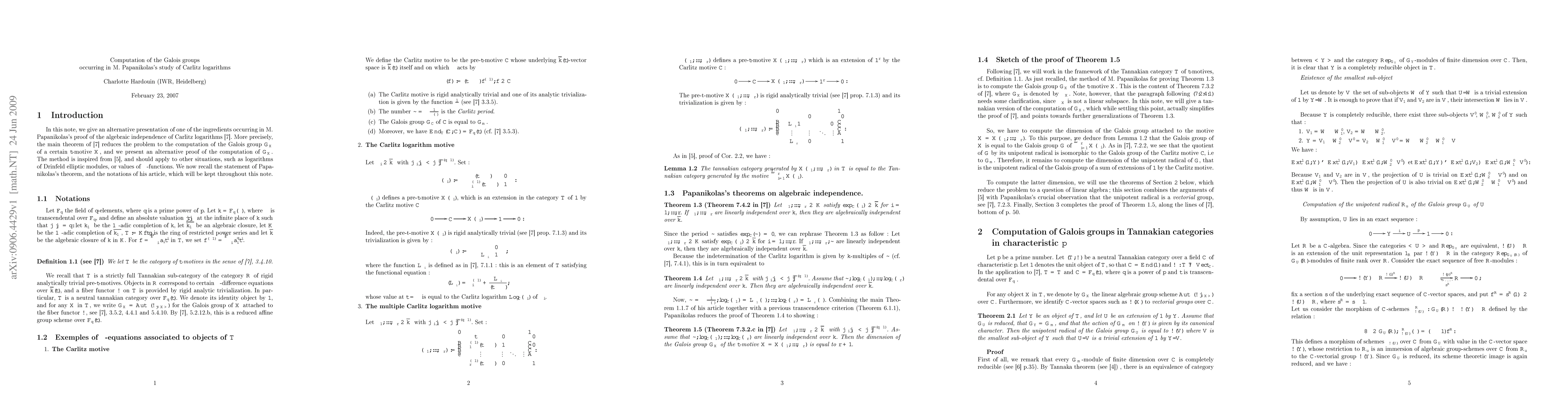 In this note, we state a theorem of compution of the unipotent radical of the Galois group of an object $U$ of a tannakian category defined over a field of positive characteristic, extension of the unit object by a semi-simple one. We then give a criteria of algebricity of solutions of the objects in terms of linear dependences in groups of extension. We apply these results to the tanakian framework of $t$-motives developped by M. Papanikolas; in particular, we give an alternative proof of the algebraic independence of Carlitz logarithms.