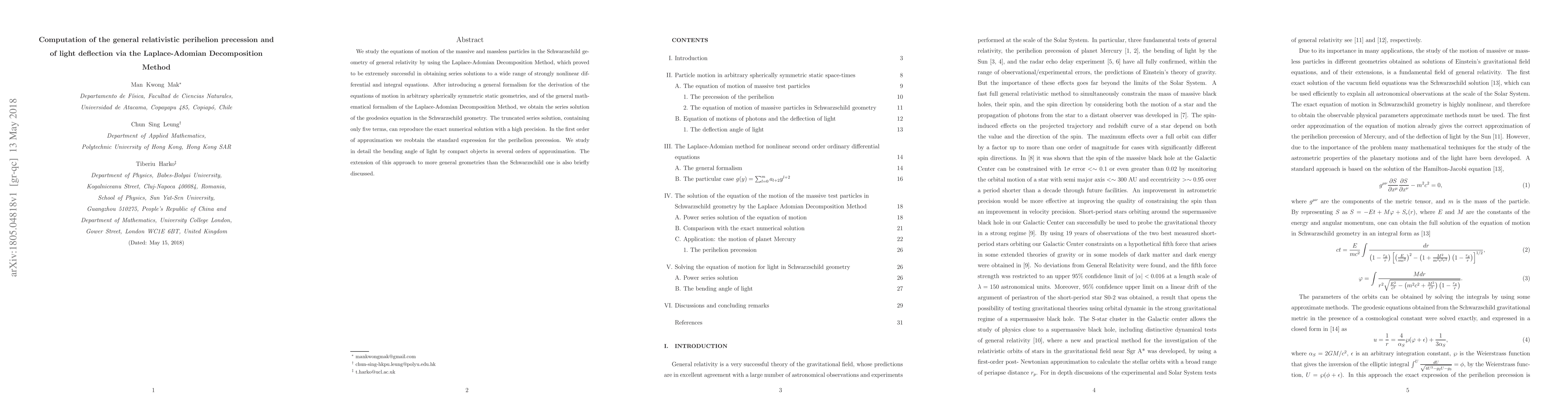 This paper employs the Laplace-Adomian Decomposition Method to compute the perihelion precession and light deflection in the Schwarzschild geometry of general relativity. The method yields a high-precision series solution for the geodesics equation, accurately reproducing the standard expressions for perihelion precession and light bending.