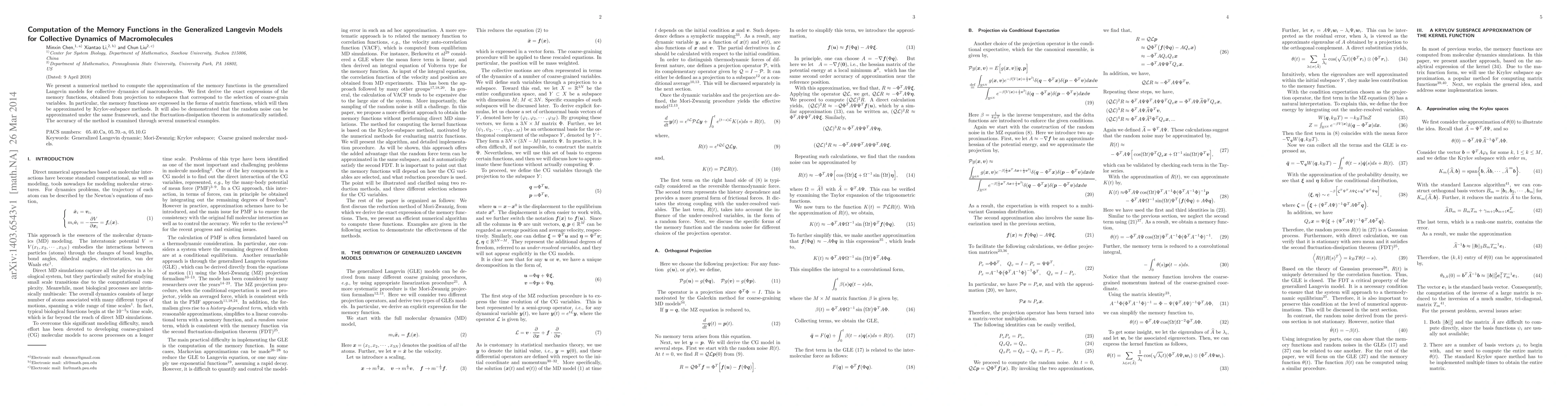 We present a numerical method to compute the approximation of the memory functions in the generalized Langevin models for collective dynamics of macromolecules. We first derive the exact expressions of the memory functions, obtained from projection to subspaces that correspond to the selection of coarse-grain variables. In particular, the memory functions are expressed in the forms of matrix functions, which will then be approximated by Krylov-subspace methods. It will also be demonstrated that the random noise can be approximated under the same framework, and the fluctuation-dissipation theorem is automatically satisfied. The accuracy of the method is examined through several numerical examples.