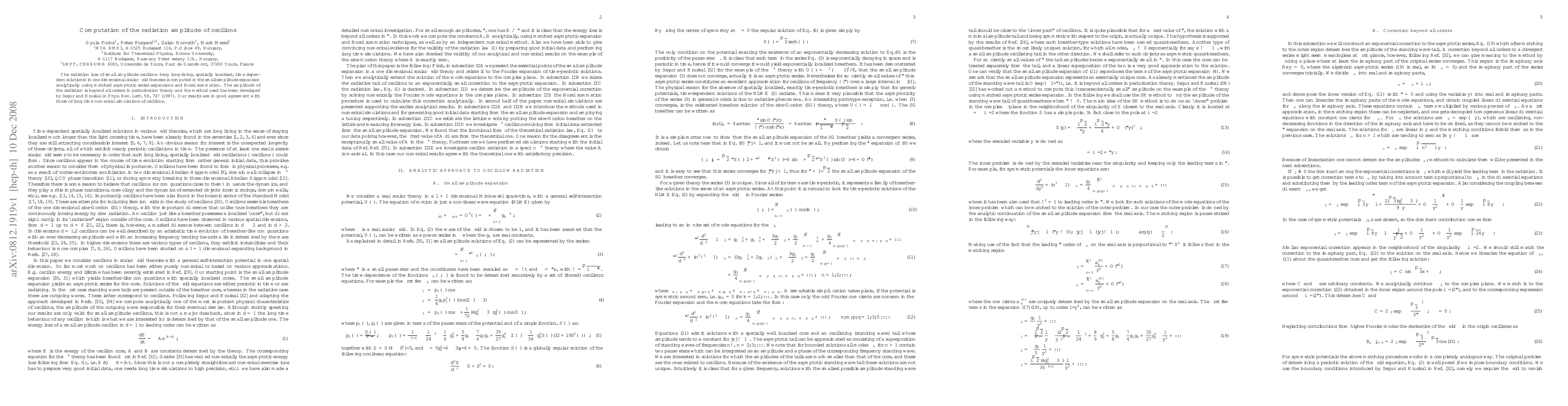 This paper analytically computes the radiation amplitude of small amplitude oscillons in one-dimensional scalar field theories using matched asymptotic series expansions and Borel summation. The method aligns well with long-time numerical simulations, confirming the robustness of the analytical approach.