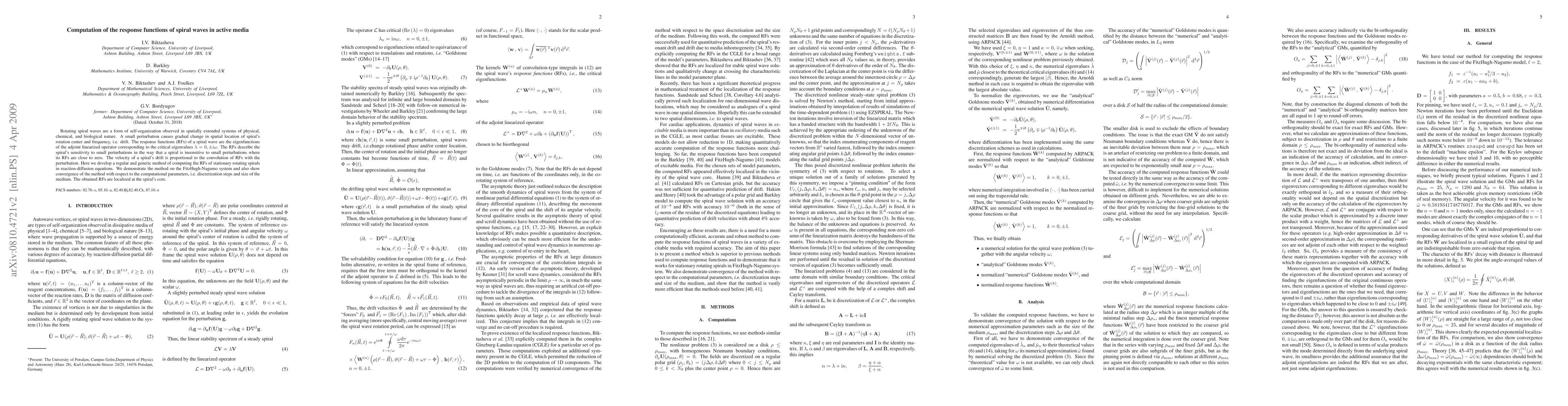 Rotating spiral waves are a form of self-organization observed in spatially extended systems of physical, chemical, and biological nature. A small perturbation causes gradual change in spatial location of spiral's rotation center and frequency, i.e. drift. The response functions (RFs) of a spiral wave are the eigenfunctions of the adjoint linearized operator corresponding to the critical eigenvalues $\lambda = 0, \pm i\omega$. The RFs describe the spiral's sensitivity to small perturbations in the way that a spiral is insensitive to small perturbations where its RFs are close to zero. The velocity of a spiral's drift is proportional to the convolution of RFs with the perturbation. Here we develop a regular and generic method of computing the RFs of stationary rotating spirals in reaction-diffusion equations. We demonstrate the method on the FitzHugh-Nagumo system and also show convergence of the method with respect to the computational parameters, i.e. discretization steps and size of the medium. The obtained RFs are localized at the spiral's core.