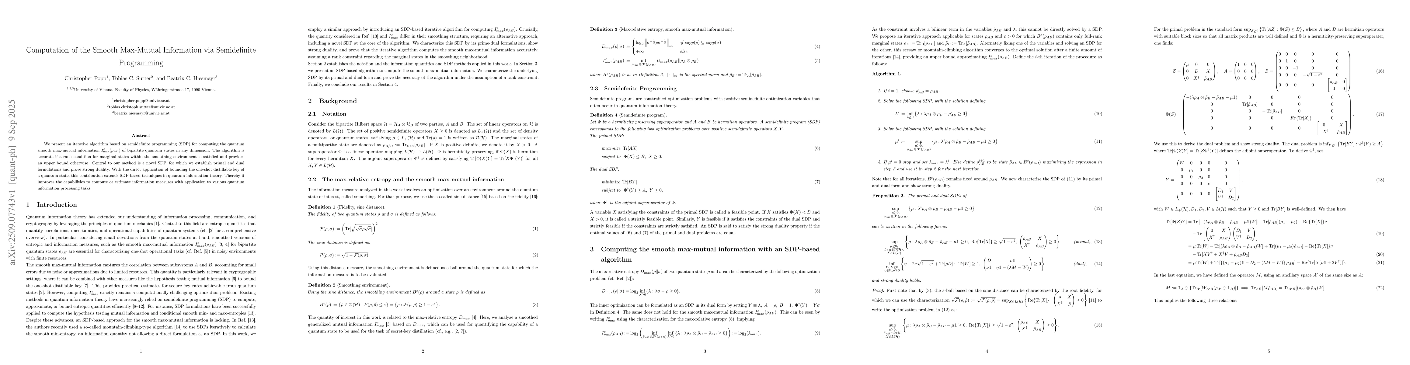 We present an iterative algorithm based on semidefinite programming (SDP) for computing the quantum smooth max-mutual information $I^\varepsilon_{\max}(\rho_{AB})$ of bipartite quantum states in any dimension. The algorithm is accurate if a rank condition for marginal states within the smoothing environment is satisfied and provides an upper bound otherwise. Central to our method is a novel SDP, for which we establish primal and dual formulations and prove strong duality. With the direct application of bounding the one-shot distillable key of a quantum state, this contribution extends SDP-based techniques in quantum information theory. Thereby it improves the capabilities to compute or estimate information measures with application to various quantum information processing tasks.