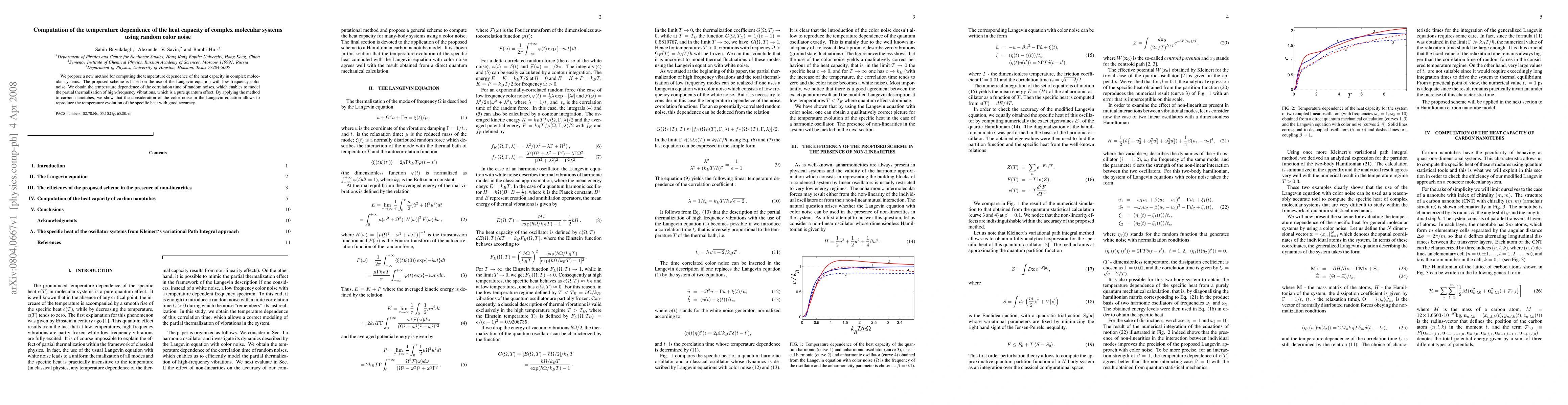 We propose a new method for computing the temperature dependence of the heat capacity in complex molecular systems. The proposed scheme is based on the use of the Langevin equation with low frequency color noise. We obtain the temperature dependence of the correlation time of random noises, which enables to model the partial thermalization of high-frequency vibrations, which is a pure quantum effect. By applying the method to carbon nanotubes, we show that the consideration of the color noise in the Langevin equation allows to reproduce the temperature evolution of the specific heat with good accuracy.