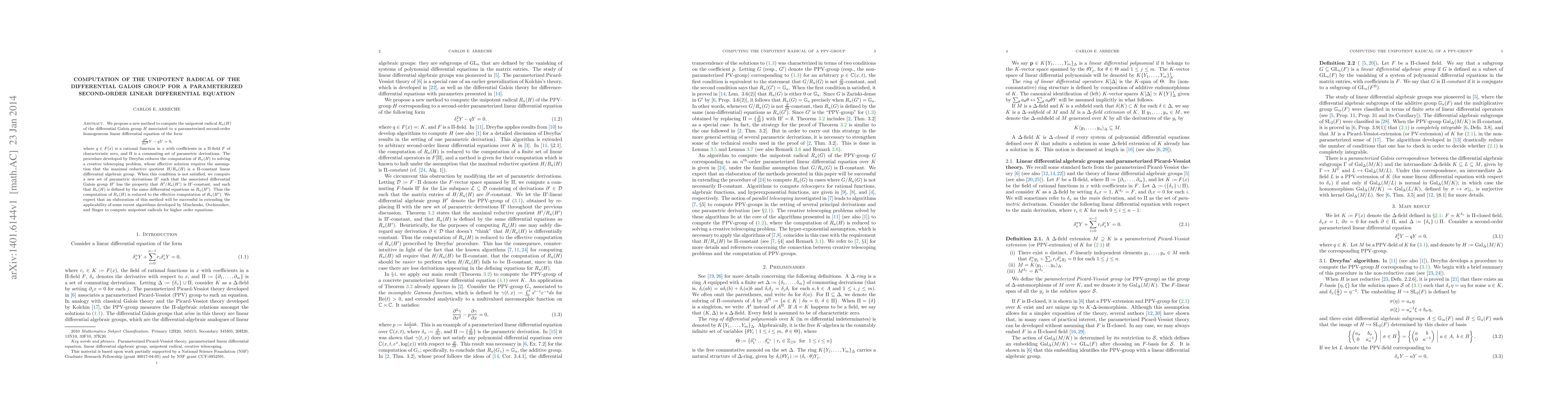 We propose a new method to compute the unipotent radical $R_u(H)$ of the differential Galois group $H$ associated to a parameterized second-order homogeneous linear differential equation of the form \[\tfrac{\partial^2}{\partial x^2}Y-qY=0,\] where $q \in F(x)$ is a rational function in $x$ with coefficients in a $\Pi$-field $F$ of characteristic zero, and $\Pi$ is a commuting set of parametric derivations. The procedure developed by Dreyfus reduces the computation of $R_u(H)$ to solving a creative telescoping problem, whose effective solution requires the assumption that the maximal reductive quotient $H / R_u(H)$ is a $\Pi$-constant linear differential algebraic group. When this condition is not satisfied, we compute a new set of parametric derivations $\Pi'$ such that the associated differential Galois group $H'$ has the property that $H'/ R_u(H')$ is $\Pi'$-constant, and such that $R_u(H)$ is defined by the same differential equations as $R_u(H')$. Thus the computation of $R_u(H)$ is reduced to the effective computation of $R_u(H')$. We expect that an elaboration of this method will be successful in extending the applicability of some recent algorithms developed by Minchenko, Ovchinnikov, and Singer to compute unipotent radicals for higher order equations.