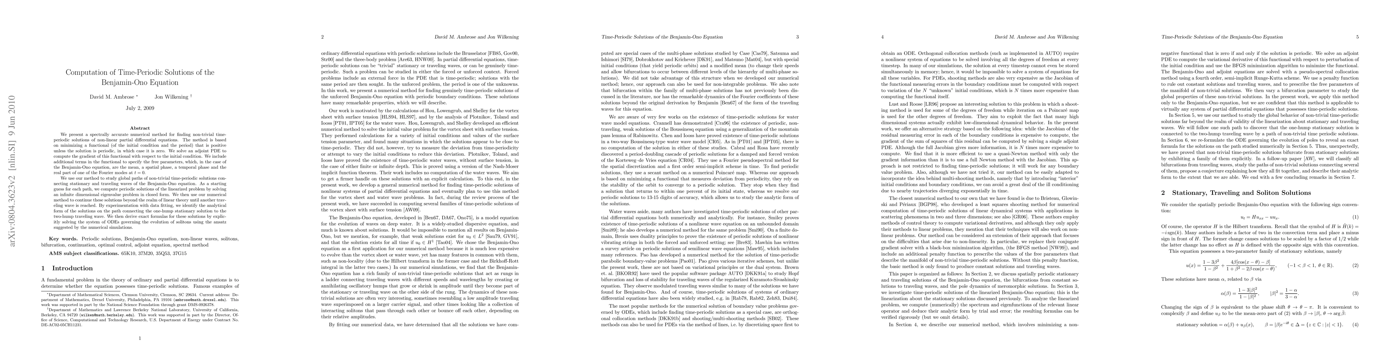 We present a spectrally accurate numerical method for finding non-trivial time-periodic solutions of non-linear partial differential equations. The method is based on minimizing a functional (of the initial condition and the period) that is positive unless the solution is periodic, in which case it is zero. We solve an adjoint PDE to compute the gradient of this functional with respect to the initial condition. We include additional terms in the functional to specify the free parameters, which, in the case of the Benjamin-Ono equation, are the mean, a spatial phase, a temporal phase and the real part of one of the Fourier modes at $t=0$. We use our method to study global paths of non-trivial time-periodic solutions connecting stationary and traveling waves of the Benjamin-Ono equation. As a starting guess for each path, we compute periodic solutions of the linearized problem by solving an infinite dimensional eigenvalue problem in closed form. We then use our numerical method to continue these solutions beyond the realm of linear theory until another traveling wave is reached. By experimentation with data fitting, we identify the analytical form of the solutions on the path connecting the one-hump stationary solution to the two-hump traveling wave. We then derive exact formulas for these solutions by explicitly solving the system of ODE's governing the evolution of solitons using the ansatz suggested by the numerical simulations.