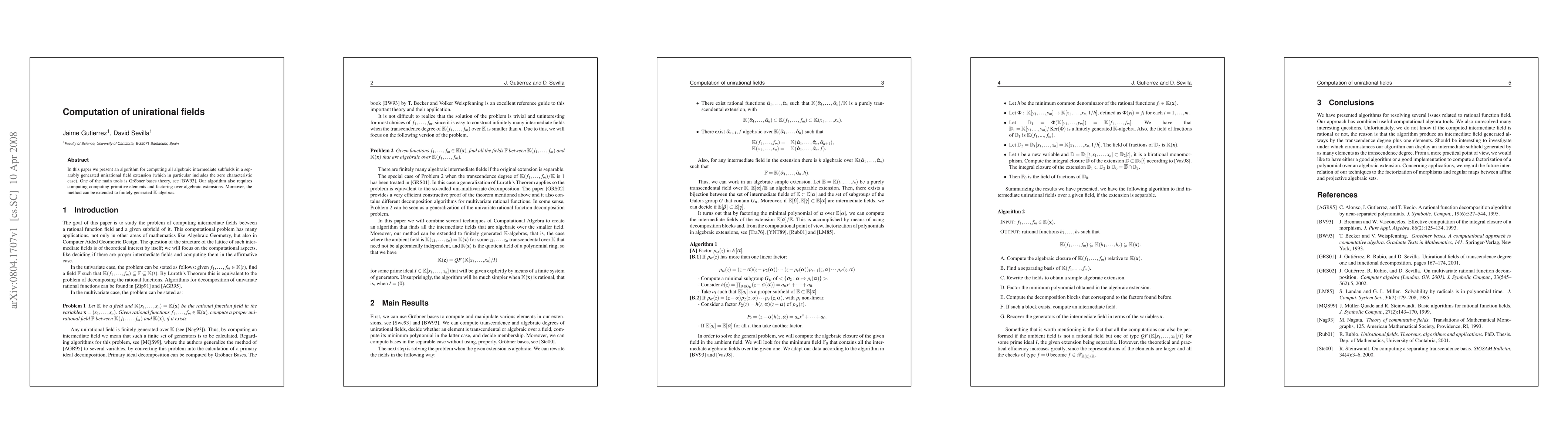 In this paper we present an algorithm for computing all algebraic intermediate subfields in a separably generated unirational field extension (which in particular includes the zero characteristic case). One of the main tools is Groebner bases theory. Our algorithm also requires computing computing primitive elements and factoring over algebraic extensions. Moreover, the method can be extended to finitely generated K-algebras.