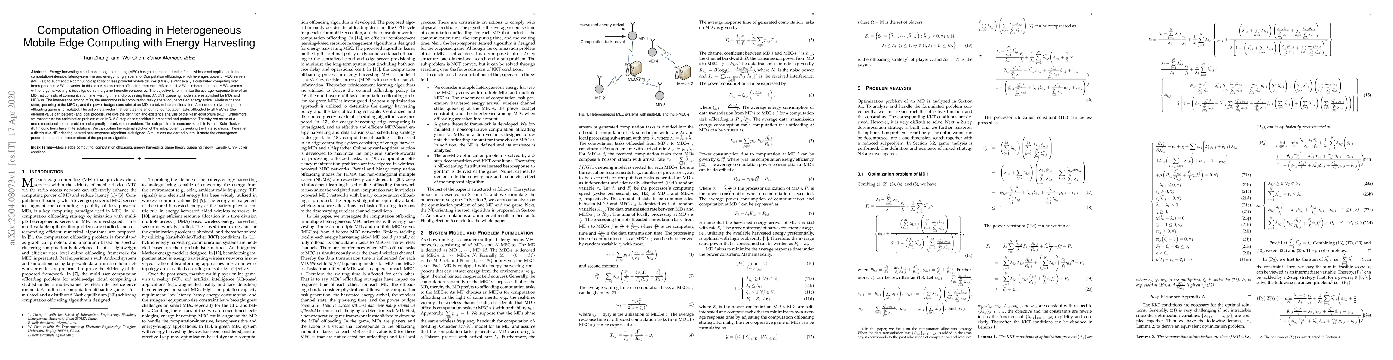 This paper investigates computation offloading in heterogeneous mobile edge computing (MEC) systems with energy harvesting, employing a game theoretic approach to minimize average response time. A noncooperative computation offloading game is formulated, and a distributive Nash equilibrium-orienting algorithm is developed, achieving optimal solutions through a 2-step decomposition and KKT conditions.