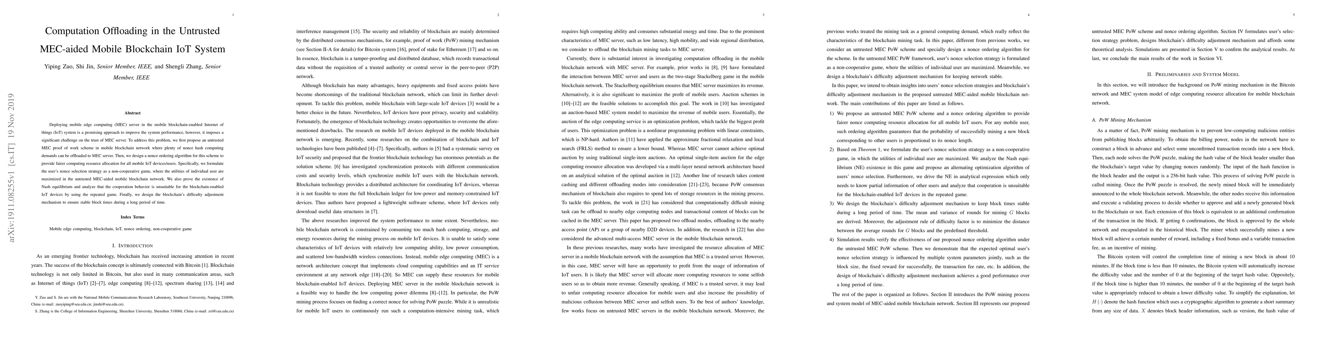 This paper proposes an untrusted MEC proof of work scheme to offload nonce hash computing tasks in a mobile blockchain IoT system, addressing trust issues with MEC servers. It introduces a nonce ordering algorithm for fairer resource allocation and analyzes user behavior through a non-cooperative game, proving the existence of Nash equilibrium.