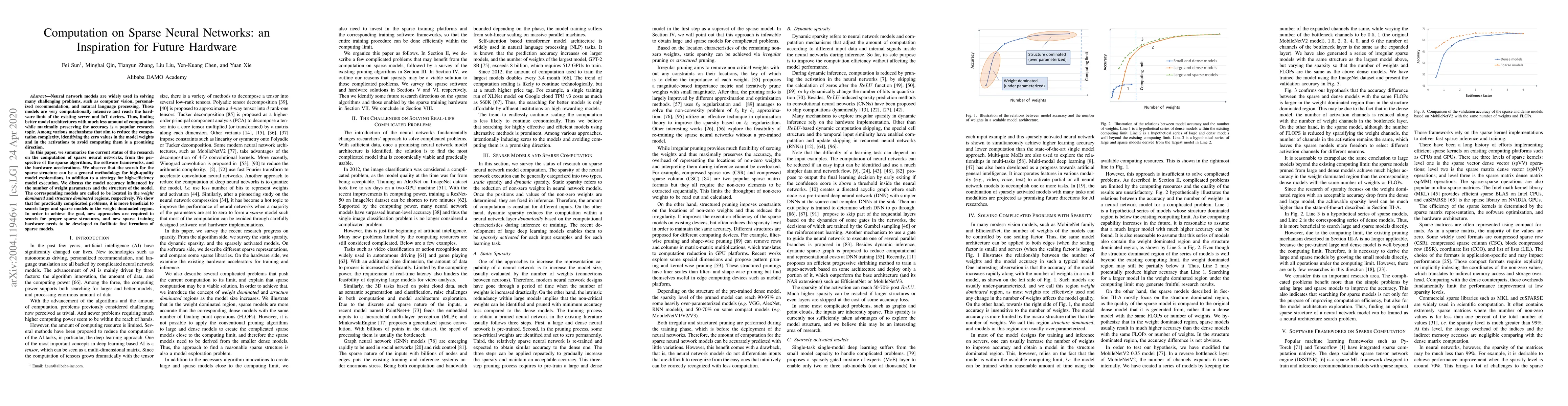 Neural network models are widely used in solving many challenging problems, such as computer vision, personalized recommendation, and natural language processing. Those models are very computationally intensive and reach the hardware limit of the existing server and IoT devices. Thus, finding better model architectures with much less amount of computation while maximally preserving the accuracy is a popular research topic. Among various mechanisms that aim to reduce the computation complexity, identifying the zero values in the model weights and in the activations to avoid computing them is a promising direction. In this paper, we summarize the current status of the research on the computation of sparse neural networks, from the perspective of the sparse algorithms, the software frameworks, and the hardware accelerations. We observe that the search for the sparse structure can be a general methodology for high-quality model explorations, in addition to a strategy for high-efficiency model execution. We discuss the model accuracy influenced by the number of weight parameters and the structure of the model. The corresponding models are called to be located in the weight dominated and structure dominated regions, respectively. We show that for practically complicated problems, it is more beneficial to search large and sparse models in the weight dominated region. In order to achieve the goal, new approaches are required to search for proper sparse structures, and new sparse training hardware needs to be developed to facilitate fast iterations of sparse models.