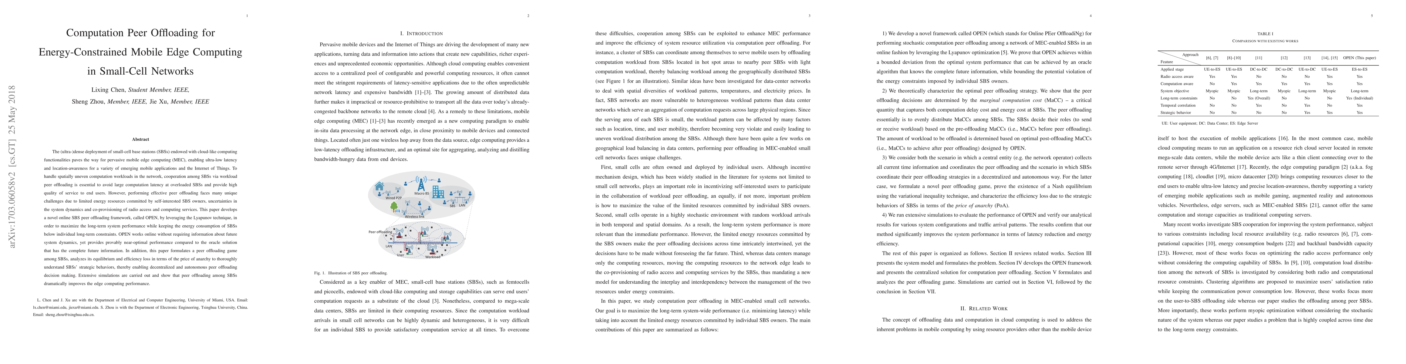 This paper proposes an online peer offloading framework, OPEN, for small-cell networks to manage uneven computation workloads, leveraging Lyapunov techniques to optimize long-term performance while respecting energy constraints. It also analyzes a peer offloading game among SBSs to understand strategic behaviors and improve decentralized decision-making.