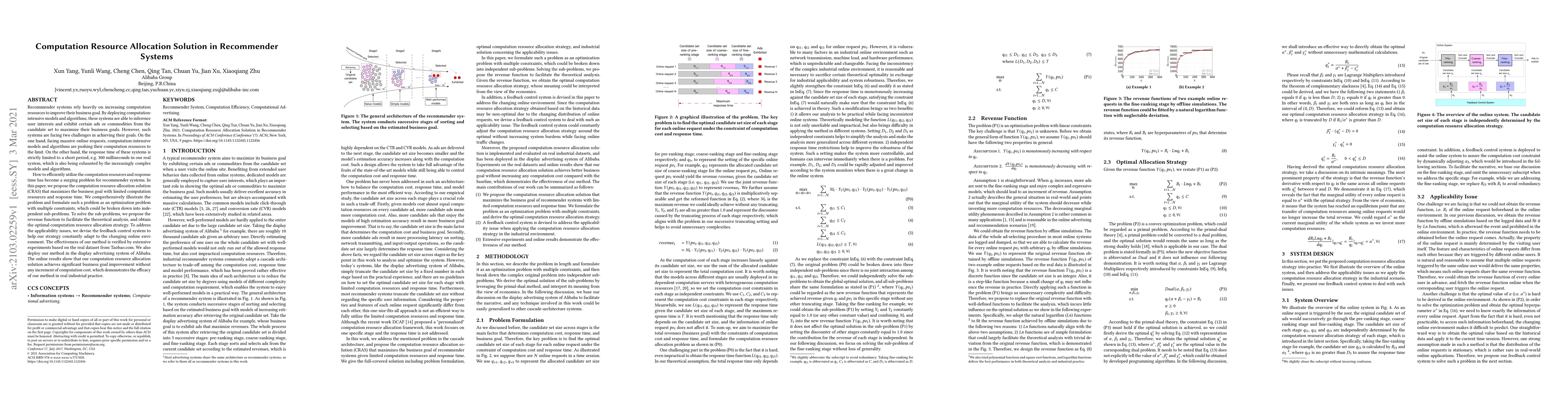 This paper proposes a computation resource allocation solution (CRAS) to optimize the performance of recommender systems under resource constraints and strict response time limits. The authors formulate the problem as an optimization task, develop a revenue function for analysis, and implement a feedback control system for adaptability, demonstrating significant business goal improvements in real-world applications on Alibaba's display advertising system.