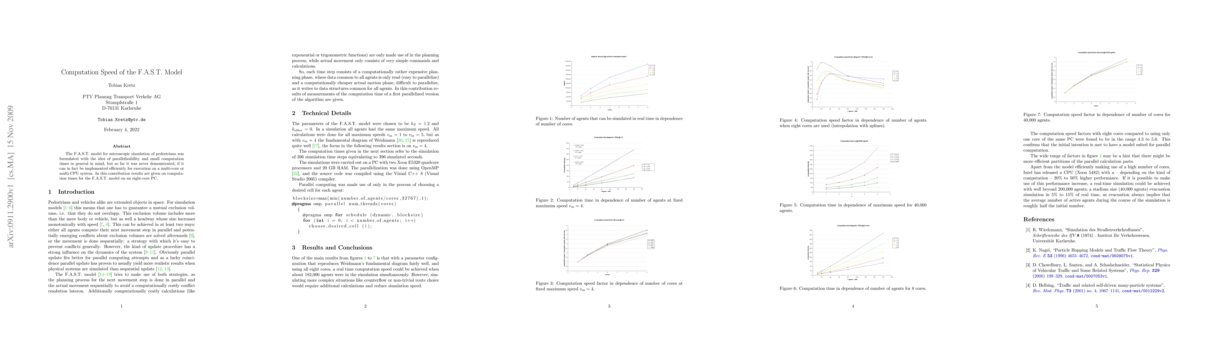 The F.A.S.T. model for microscopic simulation of pedestrians was formulated with the idea of parallelizability and small computation times in general in mind, but so far it was never demonstrated, if it can in fact be implemented efficiently for execution on a multi-core or multi-CPU system. In this contribution results are given on computation times for the F.A.S.T. model on an eight-core PC.