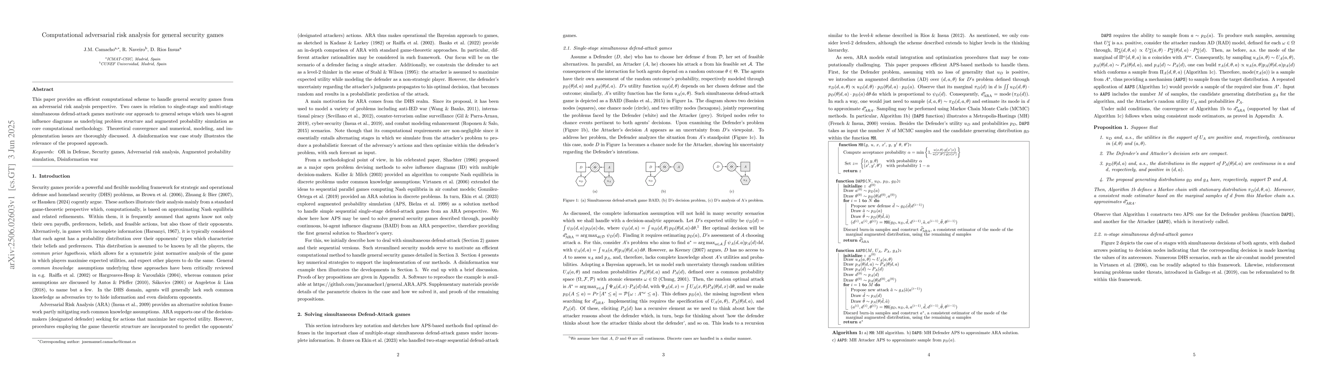 This paper provides an efficient computational scheme to handle general security games from an adversarial risk analysis perspective. Two cases in relation to single-stage and multi-stage simultaneous defend-attack games motivate our approach to general setups which uses bi-agent influence diagrams as underlying problem structure and augmented probability simulation as core computational methodology. Theoretical convergence and numerical, modeling, and implementation issues are thoroughly discussed. A disinformation war case study illustrates the relevance of the proposed approach.