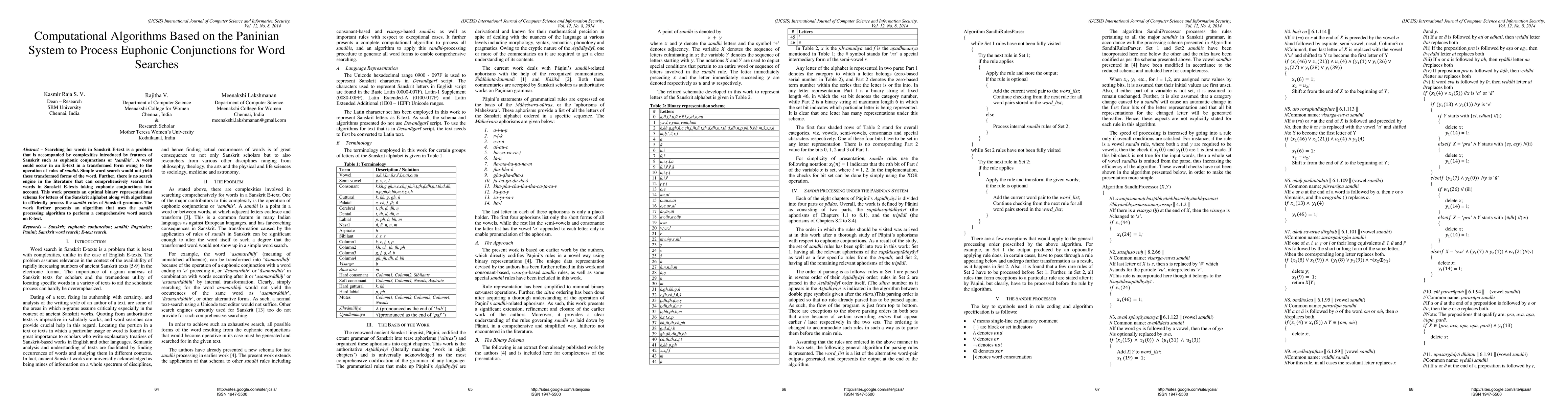 Searching for words in Sanskrit E-text is a problem that is accompanied by complexities introduced by features of Sanskrit such as euphonic conjunctions or sandhis. A word could occur in an E-text in a transformed form owing to the operation of rules of sandhi. Simple word search would not yield these transformed forms of the word. Further, there is no search engine in the literature that can comprehensively search for words in Sanskrit E-texts taking euphonic conjunctions into account. This work presents an optimal binary representational schema for letters of the Sanskrit alphabet along with algorithms to efficiently process the sandhi rules of Sanskrit grammar. The work further presents an algorithm that uses the sandhi processing algorithm to perform a comprehensive word search on E-text.