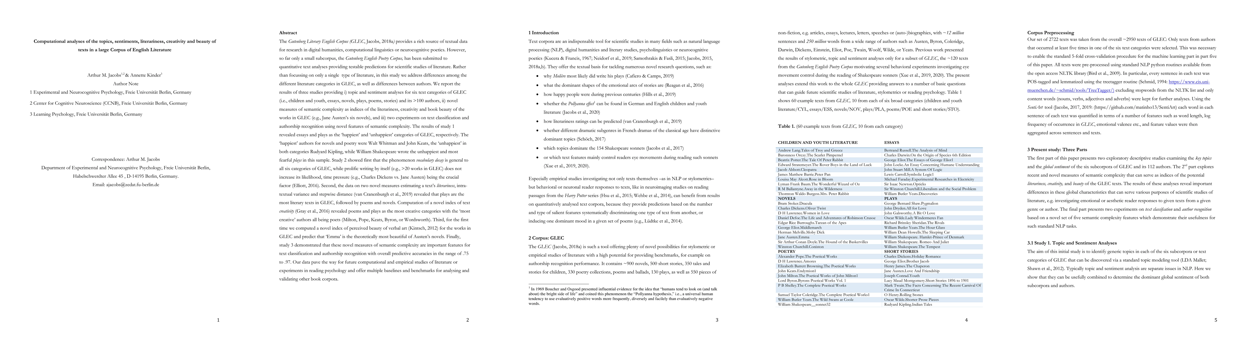 The Gutenberg Literary English Corpus (GLEC, Jacobs, 2018a) provides a rich source of textual data for research in digital humanities, computational linguistics or neurocognitive poetics. In this study we address differences among the different literature categories in GLEC, as well as differences between authors. We report the results of three studies providing i) topic and sentiment analyses for six text categories of GLEC (i.e., children and youth, essays, novels, plays, poems, stories) and its >100 authors, ii) novel measures of semantic complexity as indices of the literariness, creativity and book beauty of the works in GLEC (e.g., Jane Austen's six novels), and iii) two experiments on text classification and authorship recognition using novel features of semantic complexity. The data on two novel measures estimating a text's literariness, intratextual variance and stepwise distance (van Cranenburgh et al., 2019) revealed that plays are the most literary texts in GLEC, followed by poems and novels. Computation of a novel index of text creativity (Gray et al., 2016) revealed poems and plays as the most creative categories with the most creative authors all being poets (Milton, Pope, Keats, Byron, or Wordsworth). We also computed a novel index of perceived beauty of verbal art (Kintsch, 2012) for the works in GLEC and predict that Emma is the theoretically most beautiful of Austen's novels. Finally, we demonstrate that these novel measures of semantic complexity are important features for text classification and authorship recognition with overall predictive accuracies in the range of .75 to .97. Our data pave the way for future computational and empirical studies of literature or experiments in reading psychology and offer multiple baselines and benchmarks for analysing and validating other book corpora.