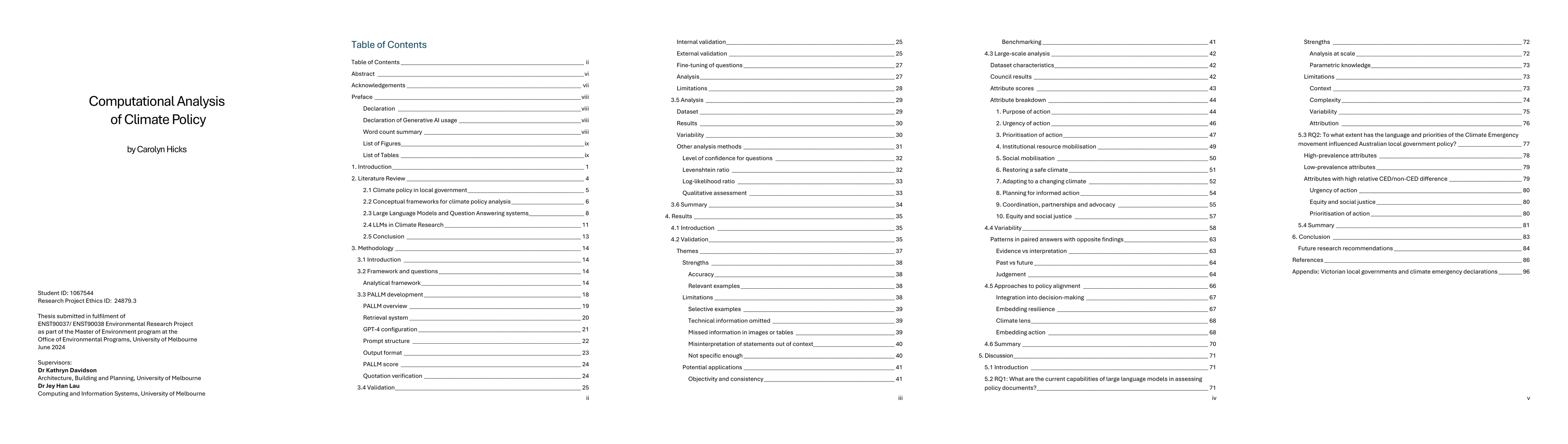 This thesis explores the impact of the Climate Emergency movement on local government climate policy, using computational methods. The Climate Emergency movement sought to accelerate climate action at local government level through the mechanism of Climate Emergency Declarations (CEDs), resulting in a series of commitments from councils to treat climate change as an emergency. With the aim of assessing the potential of current large language models to answer complex policy questions, I first built and configured a system named PALLM (Policy Analysis with a Large Language Model), using the OpenAI model GPT-4. This system is designed to apply a conceptual framework for climate emergency response plans to a dataset of climate policy documents. I validated the performance of this system with the help of local government policymakers, by generating analyses of the climate policies of 11 local governments in Victoria and assessing the policymakers' level of agreement with PALLM's responses. Having established that PALLM's performance is satisfactory, I used it to conduct a large-scale analysis of current policy documents from local governments in the state of Victoria, Australia. This thesis presents the methodology and results of this analysis, comparing the results for councils which have passed a CED to those which did not. This study finds that GPT-4 is capable of high-level policy analysis, with limitations including a lack of reliable attribution, and can also enable more nuanced analysis by researchers. Its use in this research shows that councils which have passed a CED are more likely to have a recent and climate-specific policy, and show more attention to urgency, prioritisation, and equity and social justice, than councils which have not. It concludes that the ability to assess policy documents at scale opens up exciting new opportunities for policy researchers.