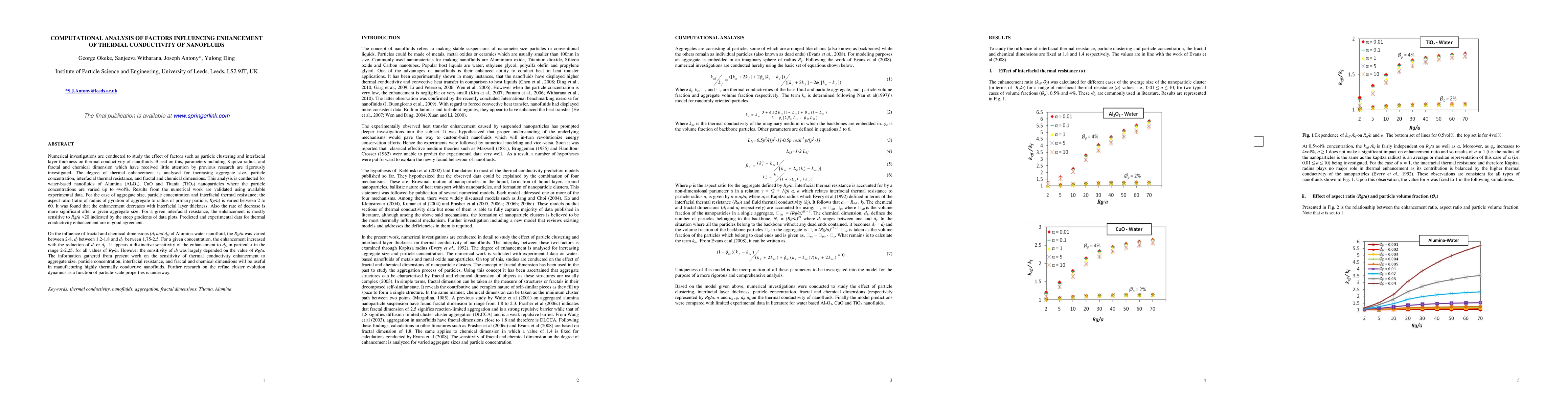 This paper investigates the numerical factors influencing the thermal conductivity enhancement of nanofluids, focusing on particle clustering and interfacial layer thickness. Key findings include a decrease in thermal enhancement with increasing interfacial layer thickness and a significant sensitivity to the aspect ratio (Rg/a) for Rg/a < 20, validated by good agreement between predicted and experimental data.