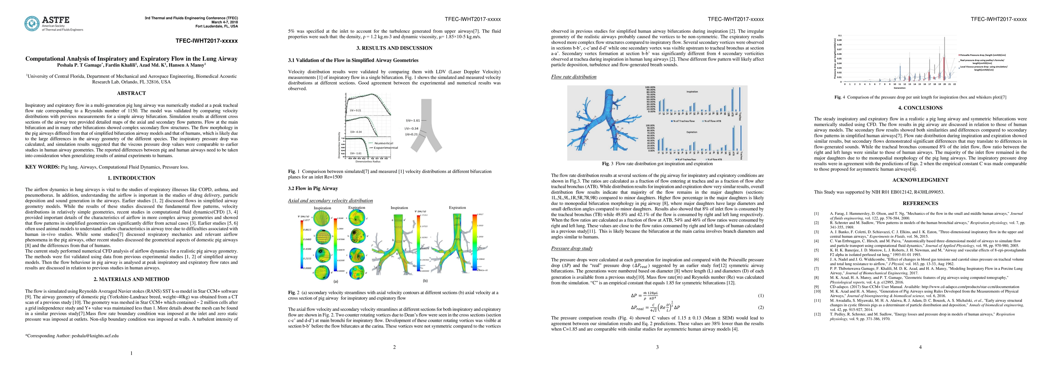 This study analyzed inspiratory and expiratory flow in a pig lung airway model, revealing complex secondary flow structures at bifurcations that differ from human airways.