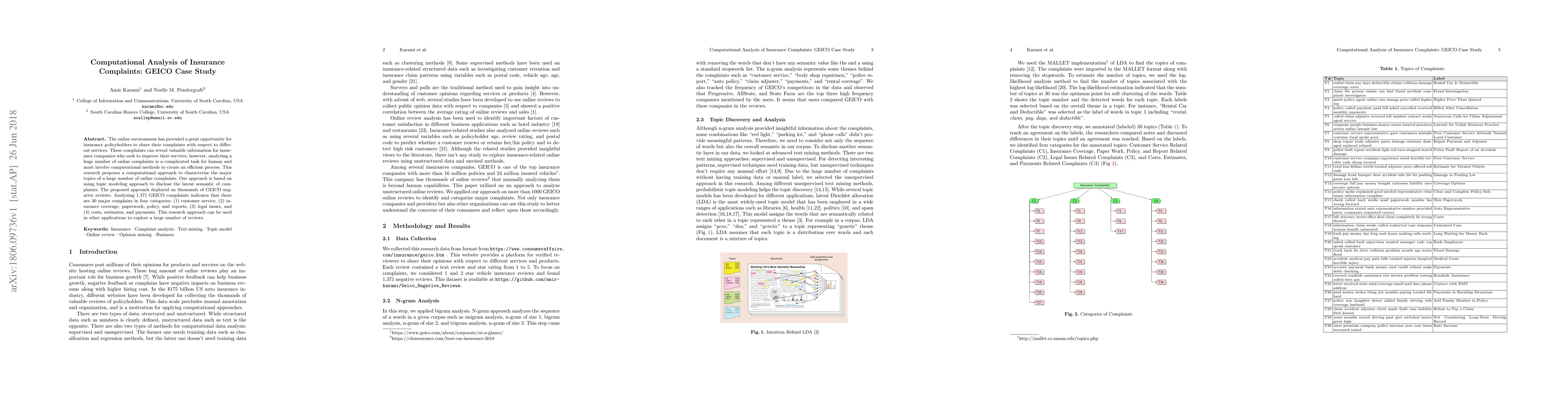 The online environment has provided a great opportunity for insurance policyholders to share their complaints with respect to different services. These complaints can reveal valuable information for insurance companies who seek to improve their services; however, analyzing a huge number of online complaints is a complicated task for human and must involve computational methods to create an efficient process. This research proposes a computational approach to characterize the major topics of a large number of online complaints. Our approach is based on using the topic modeling approach to disclose the latent semantic of complaints. The proposed approach deployed on thousands of GEICO negative reviews. Analyzing 1,371 GEICO complaints indicates that there are 30 major complains in four categories: (1) customer service, (2) insurance coverage, paperwork, policy, and reports, (3) legal issues, and (4) costs, estimates, and payments. This research approach can be used in other applications to explore a large number of reviews.