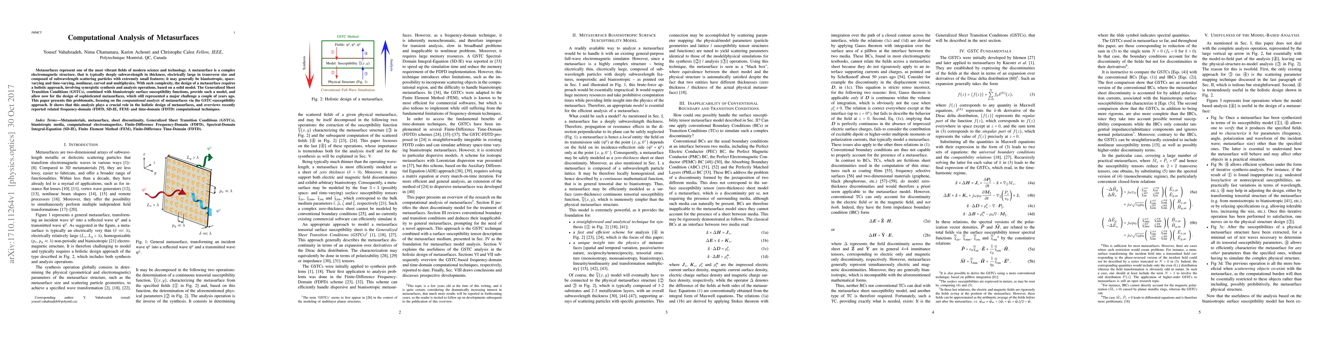 This paper explores the computational analysis of metasurfaces using the Generalized Sheet Transition Conditions (GSTCs) and bianisotropic surface susceptibility functions, emphasizing their role in the holistic design and recent computational techniques like FDFD, SD-IE, FEM, and FDTD. It highlights the significance of these methods for addressing the complex challenges in metasurface design.