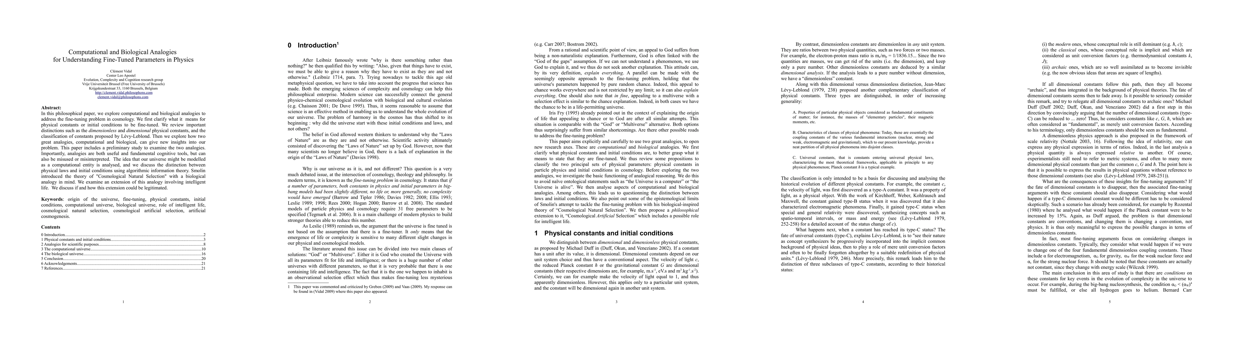 In this philosophical paper, we explore computational and biological analogies to address the fine-tuning problem in cosmology. We first clarify what it means for physical constants or initial conditions to be fine-tuned. We review important distinctions such as the dimensionless and dimensional physical constants, and the classification of constants proposed by Levy-Leblond. Then we explore how two great analogies, computational and biological, can give new insights into our problem. This paper includes a preliminary study to examine the two analogies. Importantly, analogies are both useful and fundamental cognitive tools, but can also be misused or misinterpreted. The idea that our universe might be modelled as a computational entity is analysed, and we discuss the distinction between physical laws and initial conditions using algorithmic information theory. Smolin introduced the theory of "Cosmological Natural Selection" with a biological analogy in mind. We examine an extension of this analogy involving intelligent life. We discuss if and how this extension could be legitimated. Keywords: origin of the universe, fine-tuning, physical constants, initial conditions, computational universe, biological universe, role of intelligent life, cosmological natural selection, cosmological artificial selection, artificial cosmogenesis.