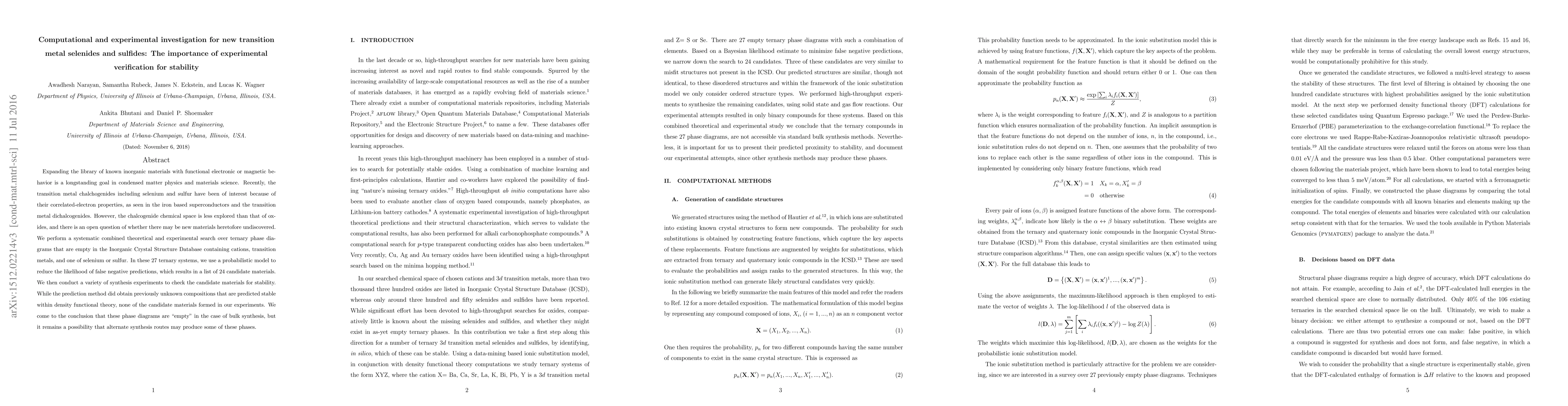 Researchers investigated 27 ternary phase diagrams for potential new transition metal selenides and sulphides with functional electronic behavior. Despite predictions of stable phases, none were found to form during synthesis experiments.
