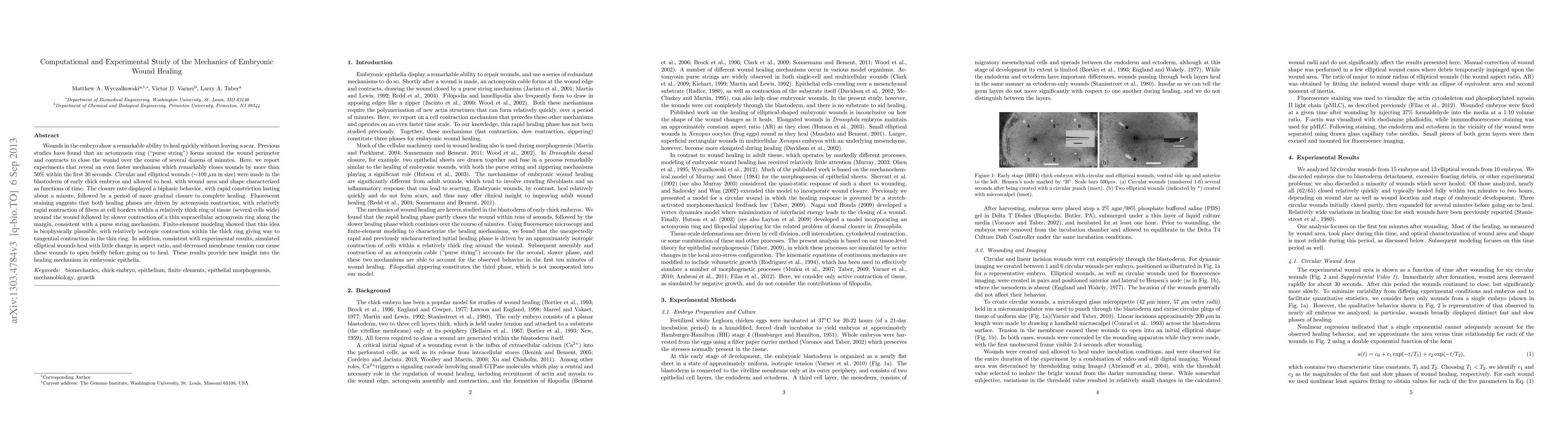 Wounds in the embryo show a remarkable ability to heal quickly without leaving a scar. Previous studies have found that an actomyosin ring ("purse string") forms around the wound perimeter and contracts to close the wound over the course of several dozens of minutes. Here, we report experiments that reveal an even faster mechanism which remarkably closes wounds by more than 50% within the first 30 seconds. Circular and elliptical wounds (~100 um in size) were made in the blastoderm of early chick embryos and allowed to heal, with wound area and shape characterized as functions of time. The closure rate displayed a biphasic behavior, with rapid constriction lasting about a minute, followed by a period of more gradual closure to complete healing. Fluorescent staining suggests that both healing phases are driven by actomyosin contraction, with relatively rapid contraction of fibers at cell borders within a relatively thick ring of tissue (several cells wide) around the wound followed by slower contraction of a thin supracellular actomyosin ring along the margin, consistent with a purse string mechanism. Finite-element modeling showed that this idea is biophysically plausible, with relatively isotropic contraction within the thick ring giving way to tangential contraction in the thin ring. In addition, consistent with experimental results, simulated elliptical wounds heal with little change in aspect ratio, and decreased membrane tension can cause these wounds to open briefly before going on to heal. These results provide new insight into the healing mechanism in embryonic epithelia.
