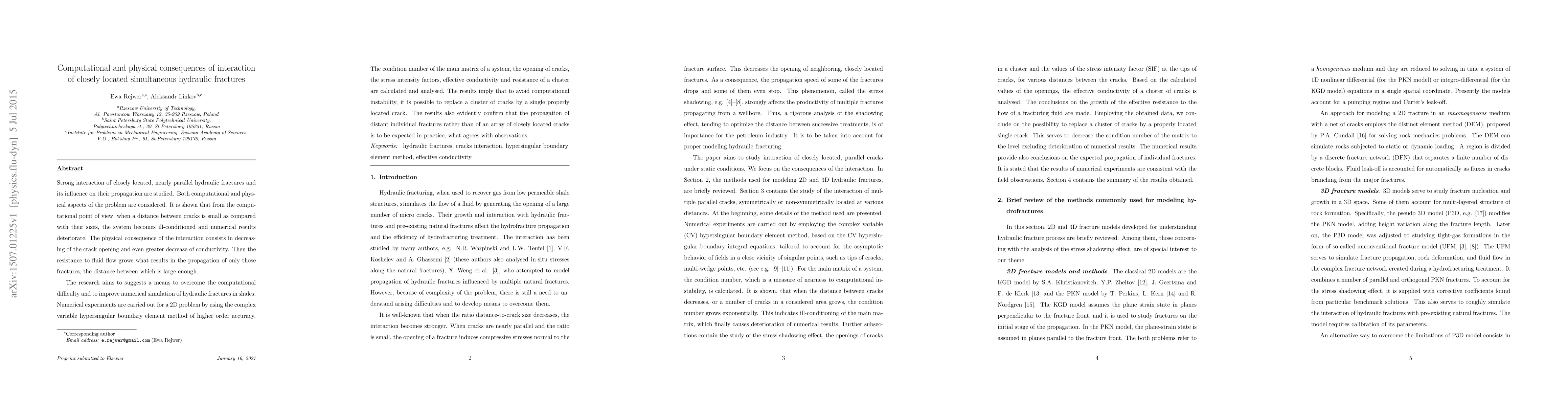 This paper investigates the interaction between closely located hydraulic fractures, highlighting computational challenges and physical consequences. The study finds that numerical simulations become unstable when fractures are too close, and physical interaction reduces crack opening and conductivity, favoring the propagation of fractures with greater separation.