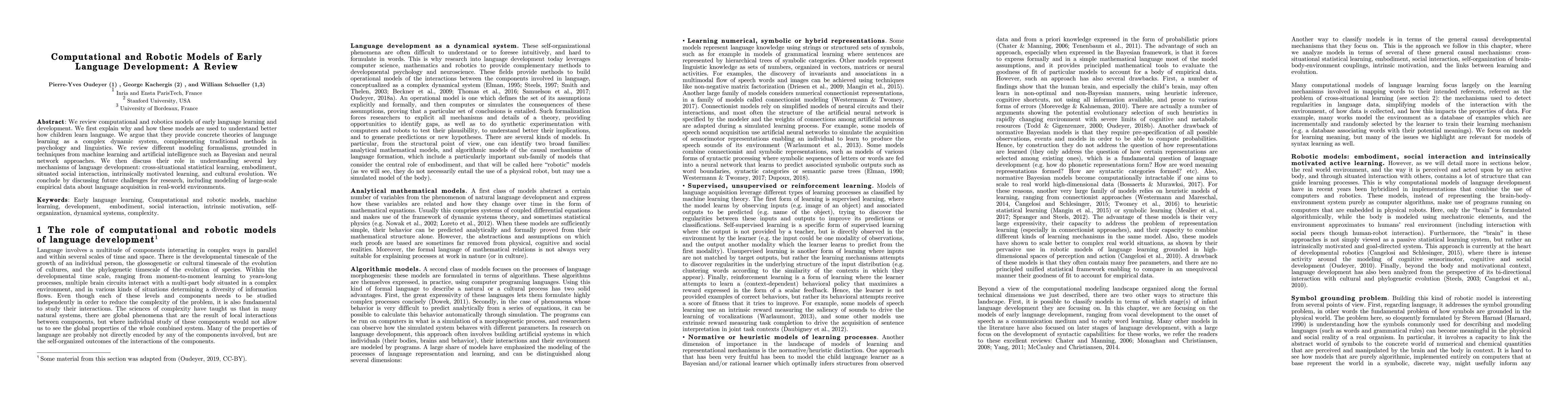This paper reviews computational and robotic models that simulate early language development, emphasizing their role in providing dynamic system theories of language learning. It discusses various modeling techniques and their application to mechanisms like statistical learning, embodiment, and social interaction, concluding with future research challenges involving large-scale data modeling.